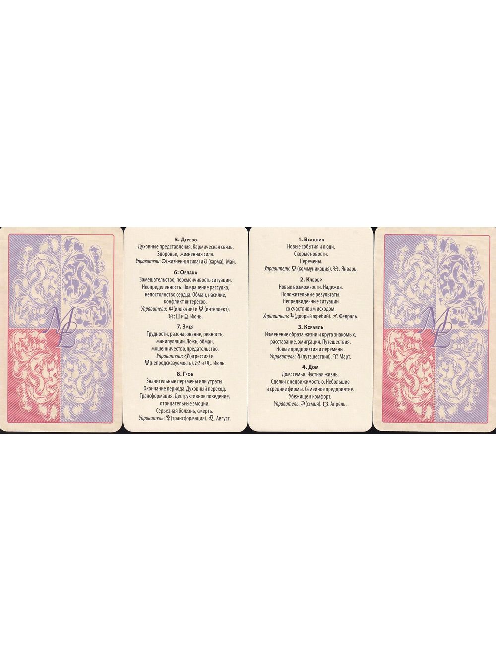 Отреставрированная оригинальная колода оракула Ленорман в формате "мини". Карты напечатаны на плотном картоне и покрыты специальным карточным лаком. В состав входит 36 листов оракула Ленорман и 9 листов со значениями карт.