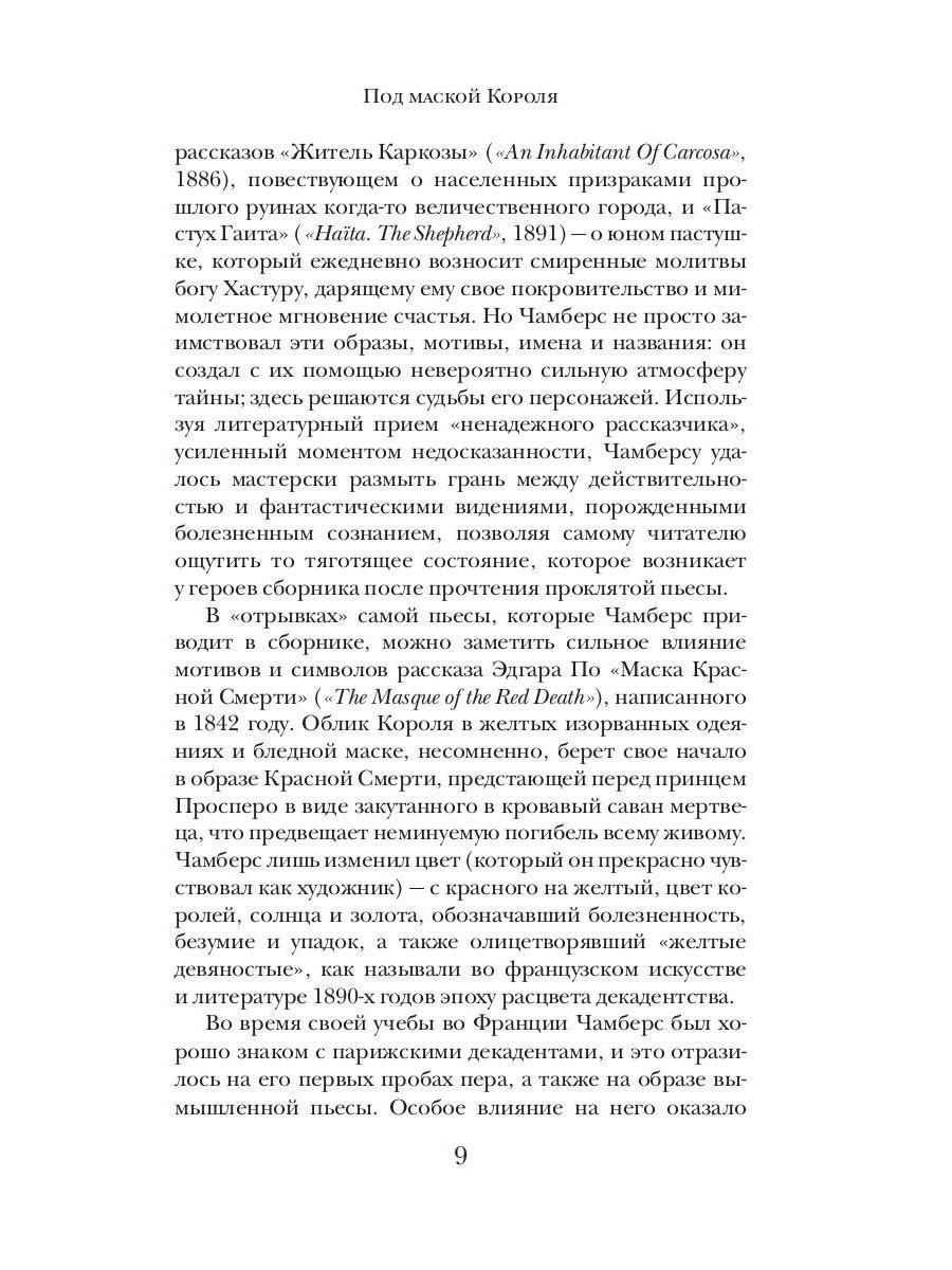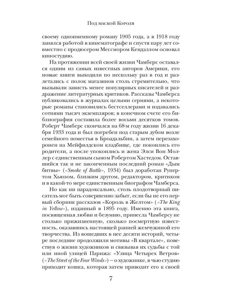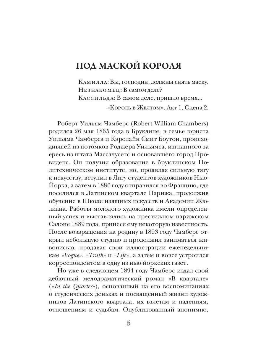 Запрещённая к распространению богохульная пьеса "Король в Жёлтом" вызывает эпидемию душевных расстройств… Тревожные сны людей друг о друге, странные совпадения и преследования в Америке и Европе… Как все эти события связаны между собой и какую роль здесь играет предание о божественно прекрасной Каркозе – городе, который должен посетить каждый поэт и мечтатель, даже если окажется заперт здесь навеки?..