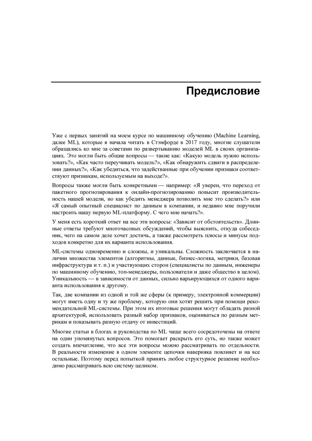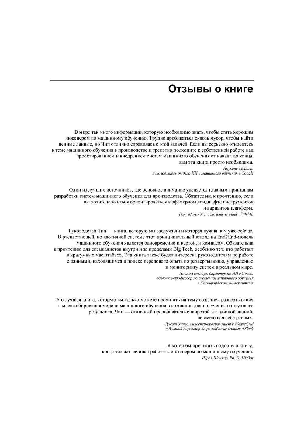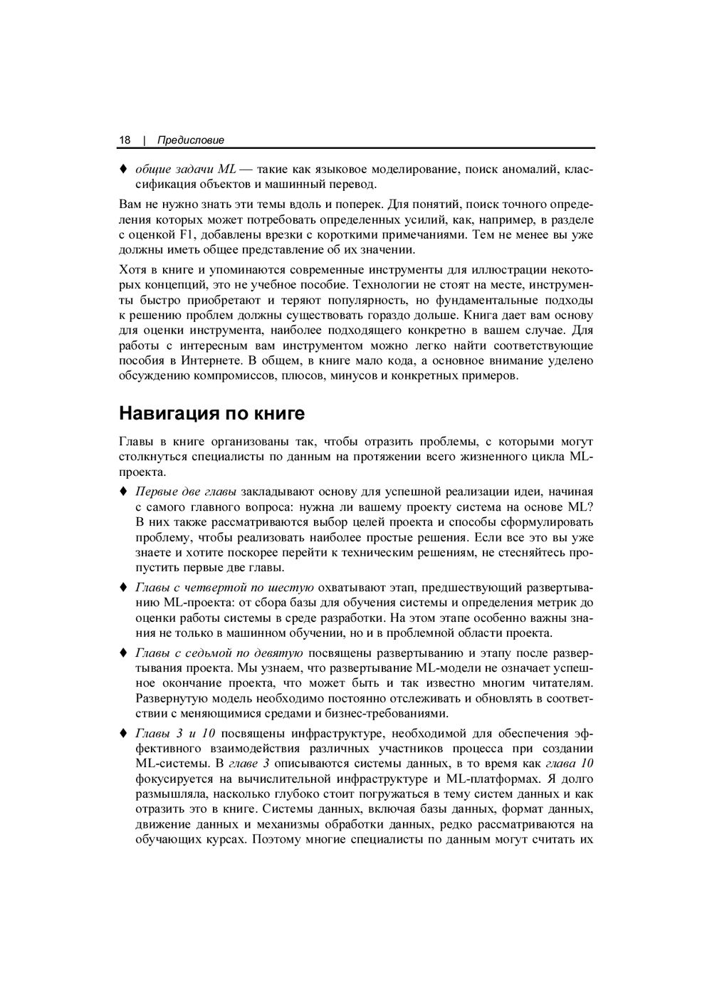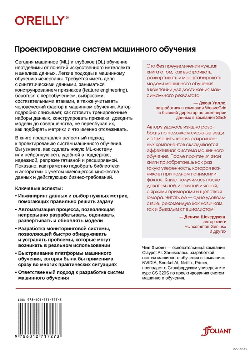 Сегодня машинное обучение – основной практический аппарат для применения искусственного интеллекта. Книга, основанная на стэнфордском учебном курсе, не ограничивается разбором конкретных библиотек, а описывает высокоуровневый подход к разработке систем машинного обучения, который упрощает их поддержку и развитие, позволяет избежать переобучения, искажения результатов. Рассказано, как сделать новую систему машинного обучения или нейронную сеть, надёжной, репрезентативной и расширяемой, а также качественно доработать уже существующие системы. Также показано, как подобрать библиотеки и алгоритмы с учётом имеющегося множества данных и действующих бизнес-требований, конструировать признаки и отслеживать метрики.