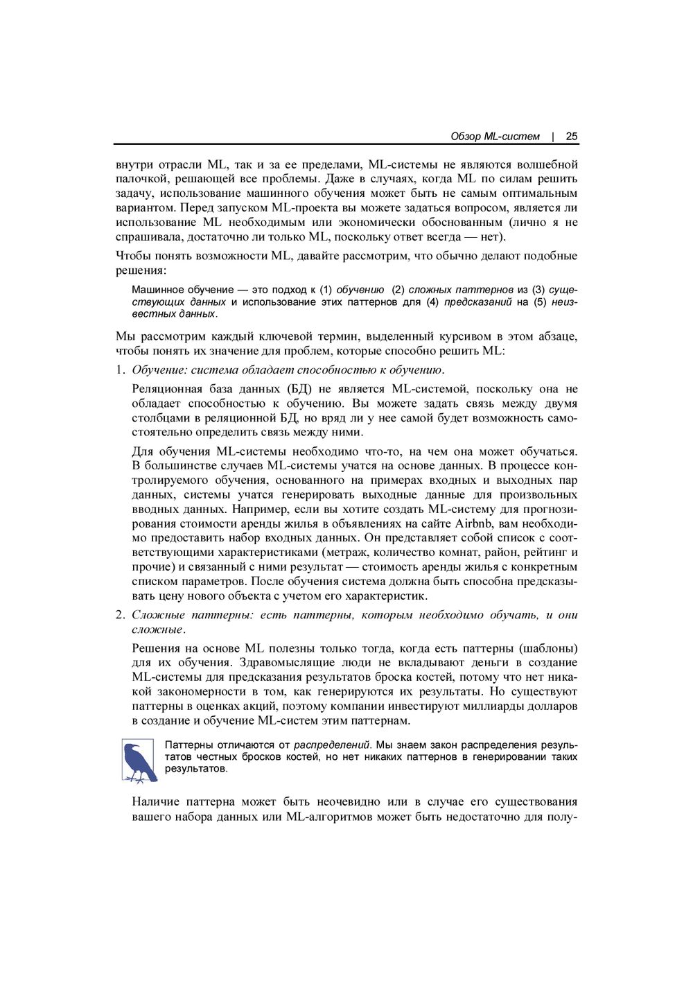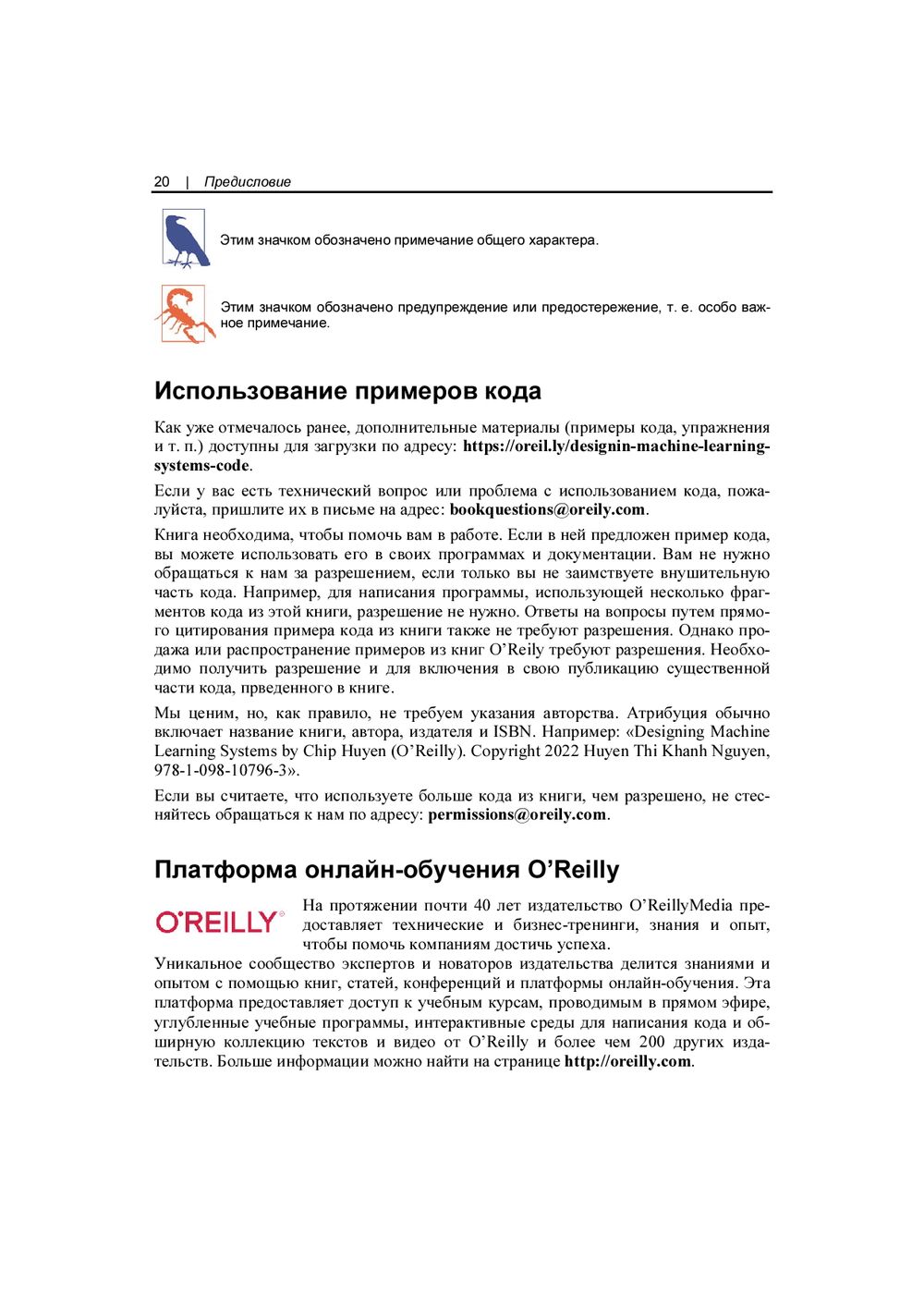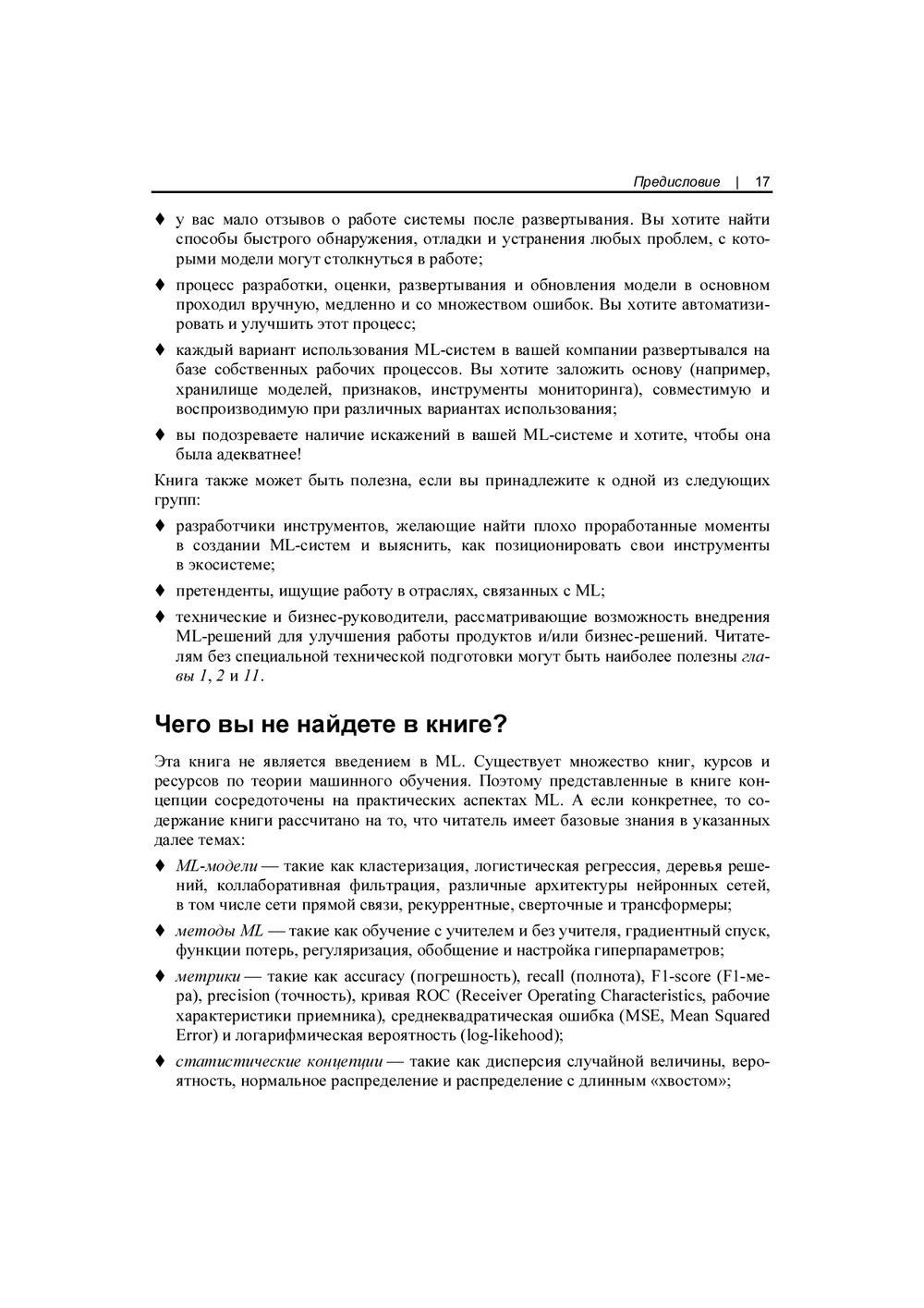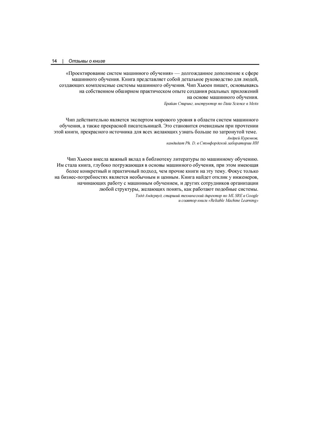 Сегодня машинное обучение – основной практический аппарат для применения искусственного интеллекта. Книга, основанная на стэнфордском учебном курсе, не ограничивается разбором конкретных библиотек, а описывает высокоуровневый подход к разработке систем машинного обучения, который упрощает их поддержку и развитие, позволяет избежать переобучения, искажения результатов. Рассказано, как сделать новую систему машинного обучения или нейронную сеть, надёжной, репрезентативной и расширяемой, а также качественно доработать уже существующие системы. Также показано, как подобрать библиотеки и алгоритмы с учётом имеющегося множества данных и действующих бизнес-требований, конструировать признаки и отслеживать метрики.
