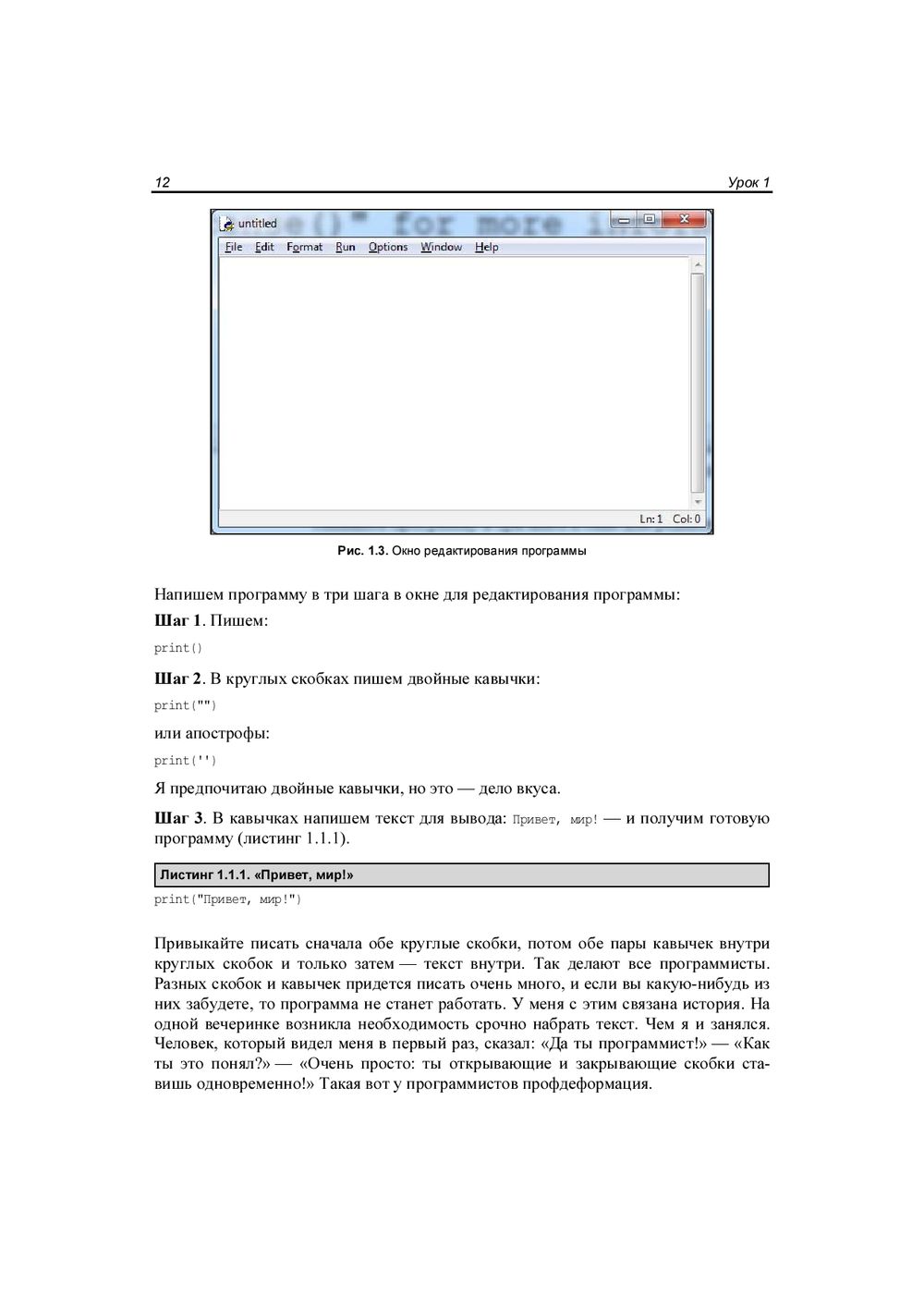 В 12 уроках показаны основы программирования и базовые конструкции языка Python. Изложены принципы различных стилей программирования. Даны понятия ввода-вывода, переменных, условий, потока чисел, циклов и списков, массивов, функций и рекурсий. Рассмотрены особенности структурного, объектно-ориентированного и функционального программирования. В каждой главе предложены практические задачи и дано их пошаговое решение с подробным описанием алгоритма.