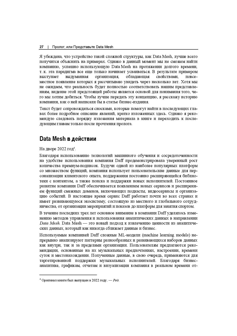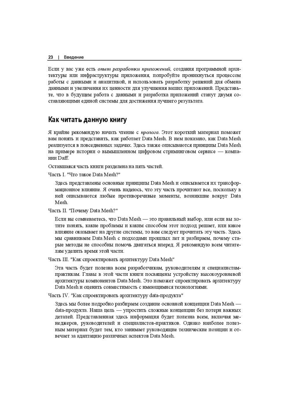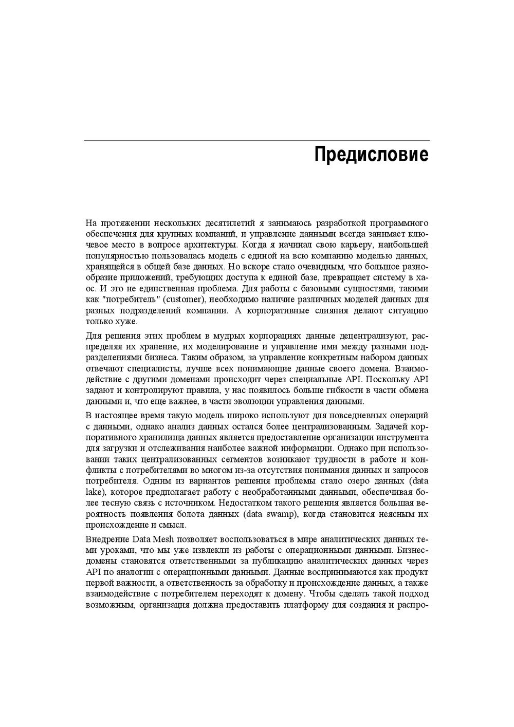 В этой книге впервые сделан подробный практический разбор новой парадигмы Data Mesh. Объяснено, как она встраивается в имеющуюся информационную инфраструктуру, как добиться самодостаточной и частично самообслуживаемой конфигурации распределённых данных в компании. Книга продолжает идеи предметно-ориентированного проектирования (DDD) и озера данных (Data Lake), раскрывает принципы федеративного цифрового управления данными.