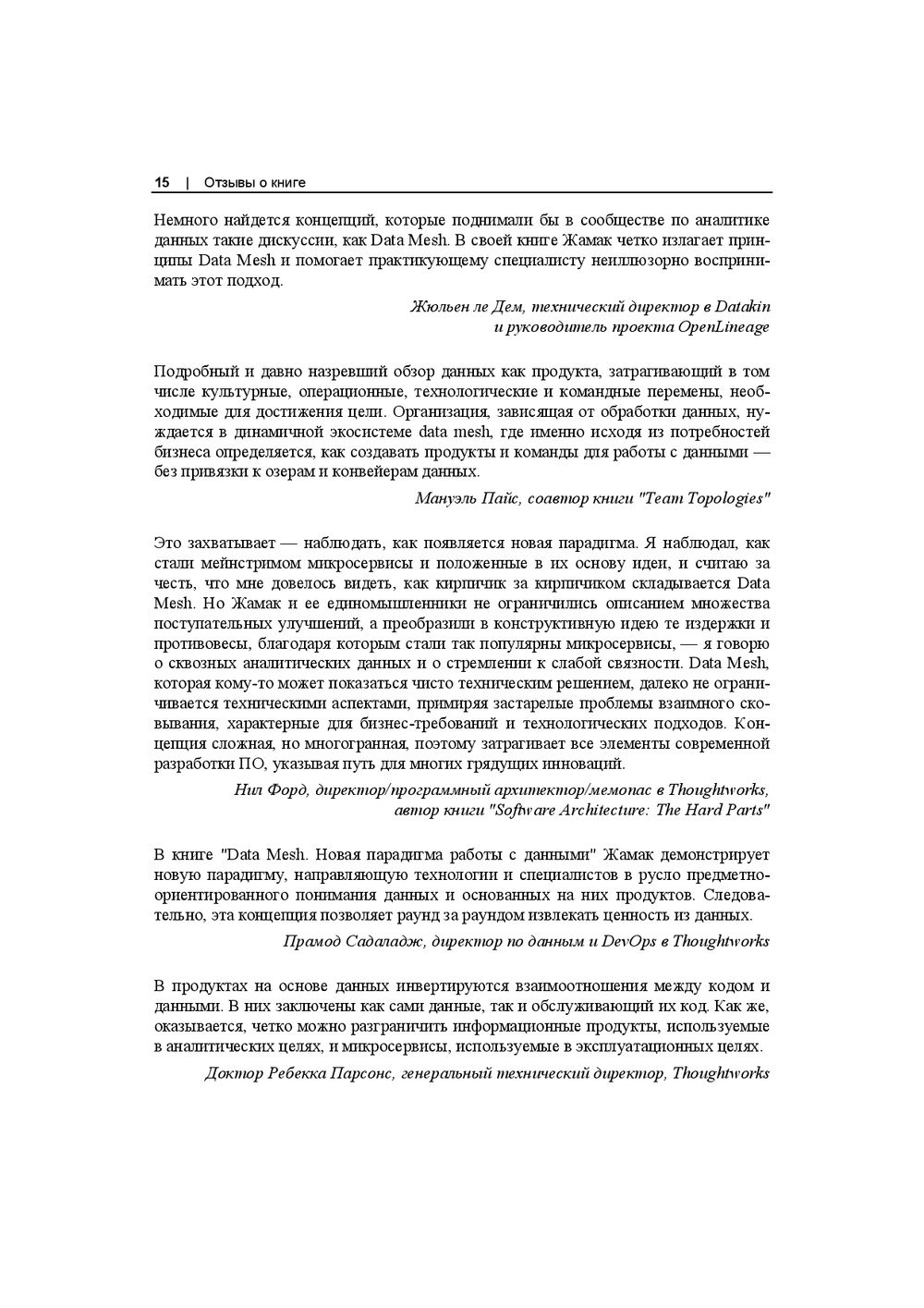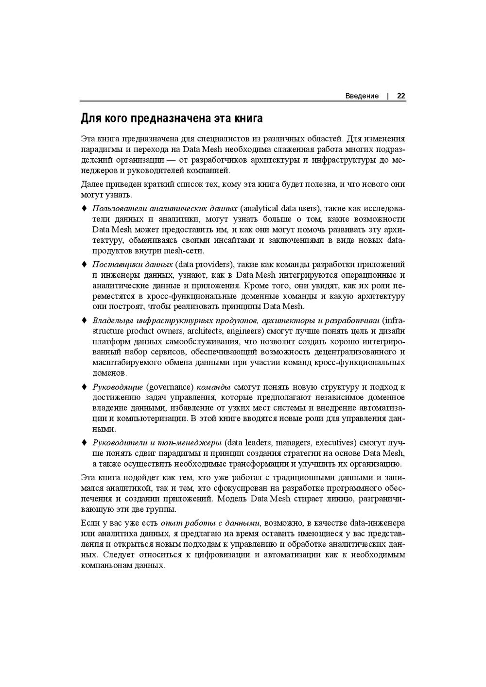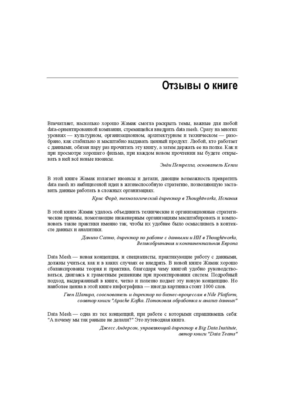 В этой книге впервые сделан подробный практический разбор новой парадигмы Data Mesh. Объяснено, как она встраивается в имеющуюся информационную инфраструктуру, как добиться самодостаточной и частично самообслуживаемой конфигурации распределённых данных в компании. Книга продолжает идеи предметно-ориентированного проектирования (DDD) и озера данных (Data Lake), раскрывает принципы федеративного цифрового управления данными.