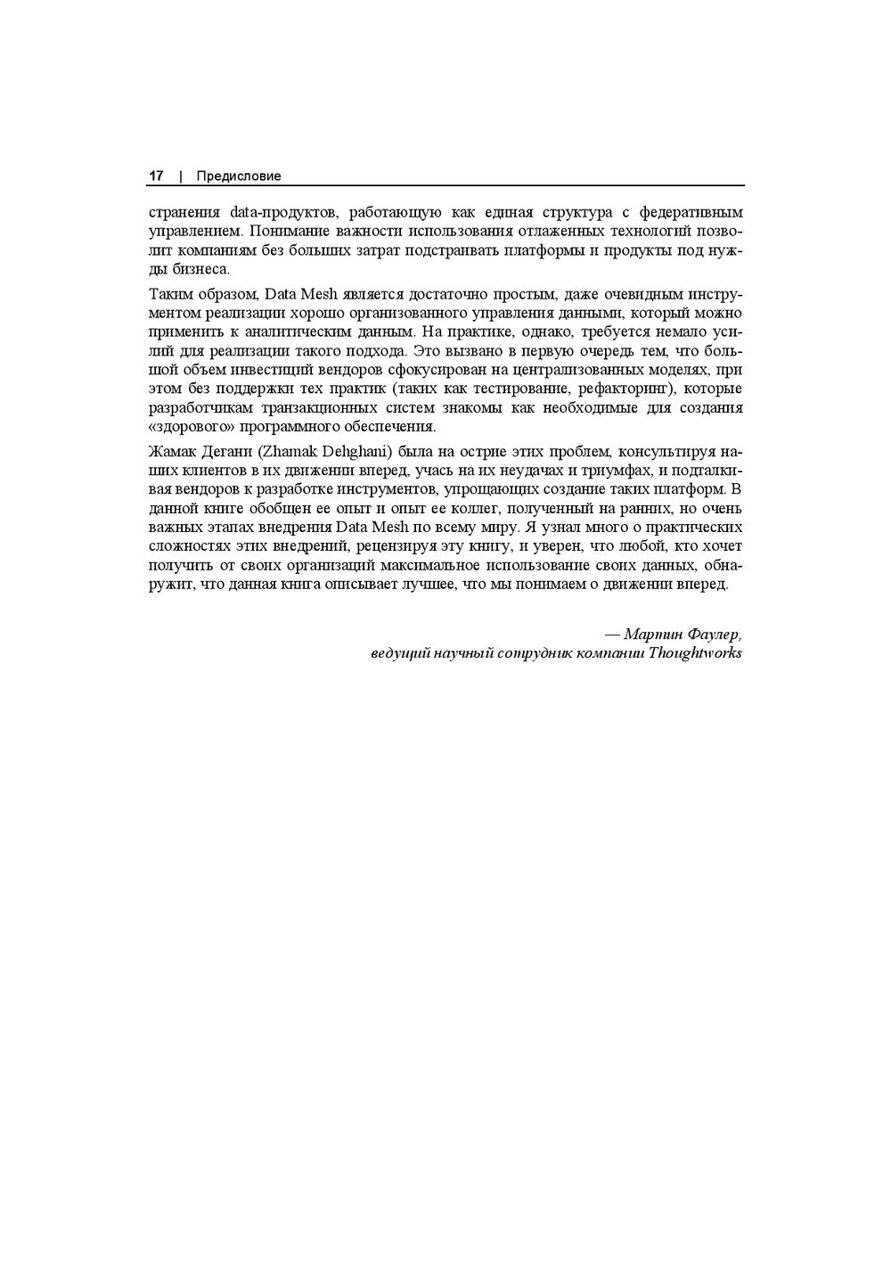 Впервые на русском языке книга об инновационной парадигме Data Mesh, продиктованной современным развитием, децентрализацией больших данных и подходами к их обработке. Изложенная концепция развивает идеи предметно-ориентированного проектирования (DDD) и озера данных (Data Lake), раскрывает принципы федеративного цифрового управления данными.