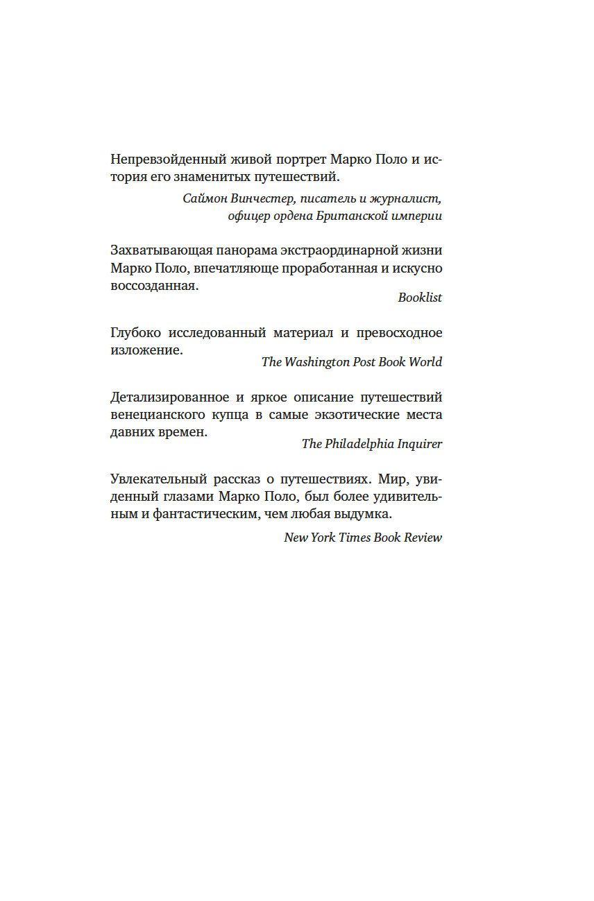 Марко Поло – купец, исследователь, авантюрист и путешественник XIII века – был первым и, пожалуй, самым известным европейцем, совершившим длительное путешествие по Азии и проложившим мост между Востоком и Западом. Странствия привели его к границам знакомого тогда Европе мира и за их пределы по опасному Шелковому пути ко двору Хубилай-хана, где он завоевал доверие могущественного правителя Монгольской империи. Вернувшись, венецианец познакомил соотечественников с культурными богатствами Востока, положив тем самым начало многовековому увлечению Азией. Первоклассный рассказчик, Лоуренс Бергрин создал самое авторитетное на сегодняшний день описание увлекательных путешествий Марко Поло, мастерски соединив жанры научного исследования, биографии и путевого дневника. Невероятная одиссея, вобравшая в себя все фантастические обстоятельства жизни отпрыска богатой купеческой семьи – от юности в Венеции и путешествия в Азию до возвращения в Европу и сочинения книги, история распространения и толкования которой не менее драматична, чем путь ее автора, – предстает в тщательно отобранных и ярких деталях. Опираясь на солидные первоисточники и материалы собственных путешествий по маршруту Поло в Китае и Монголии, Бергрин описывает жизнь человека, расширившего пределы знаний и воображения его современников, и анализирует легенды о нем, отделяя правду от вымысла, а историю от мифа. Книга выдержала множество переизданий, переведена на 14 языков.