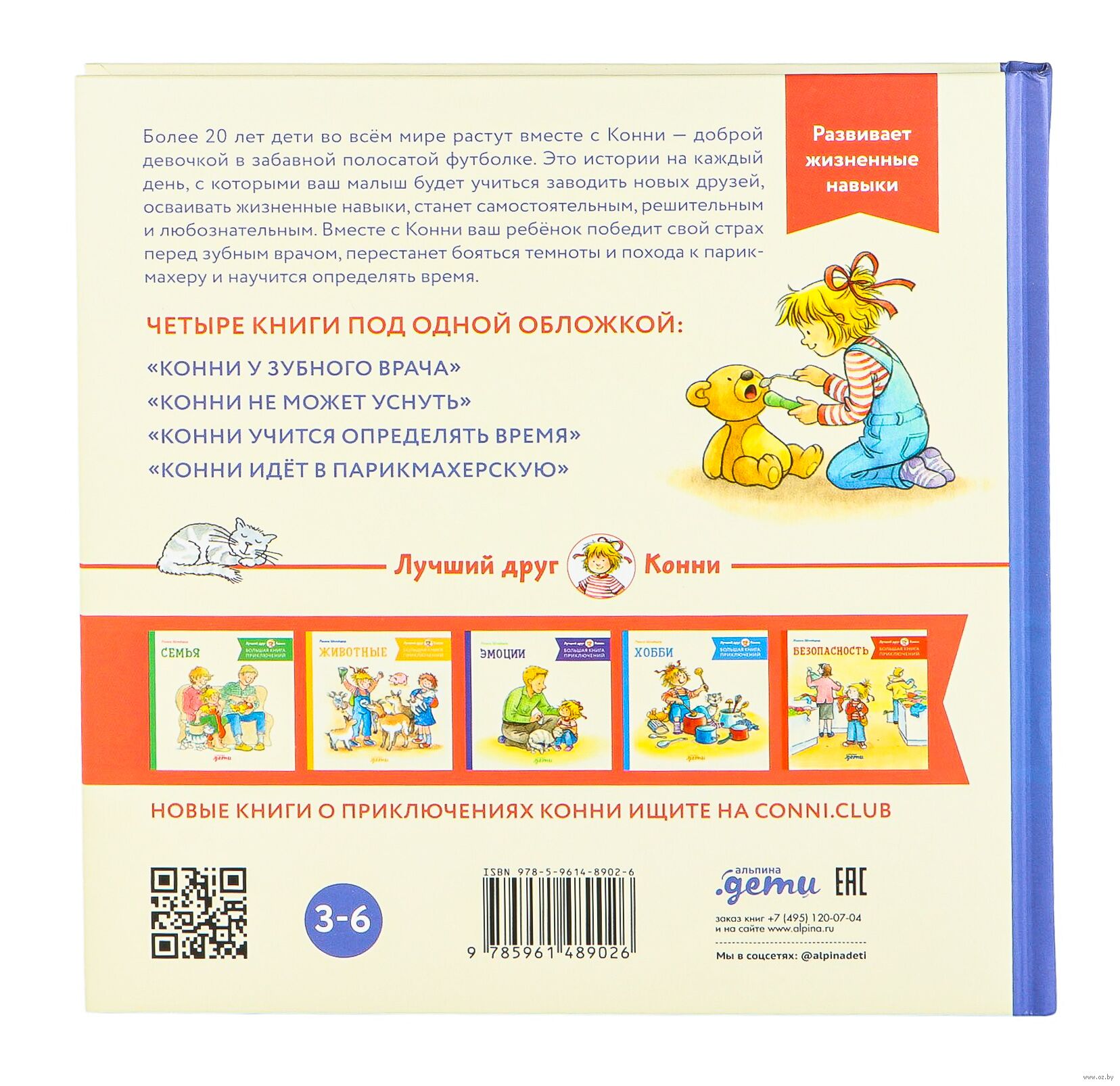Четыре истории под одной обложкой: "Конни у зубного врача", "Конни не может уснуть", "Конни учится определять время", "Конни идёт в парикмахерскую".
