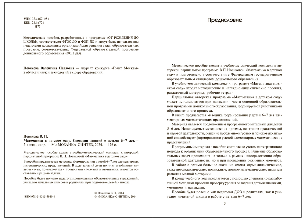 Методическое пособие входит в учебно-методический комплект к авторской парциальной программе В. П. Новиковой "Математика в детском саду".