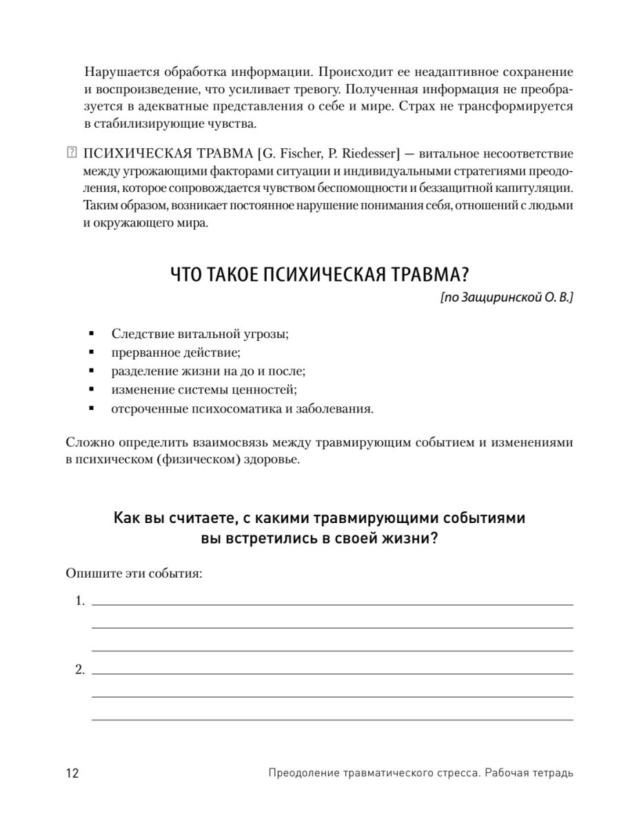 Рабочая тетрадь представляет краткий курс по преодолению психотравматического опыта и травматического стресса от ведущего российского эксперта по психотравматологии, доктора психологических наук Оксаны Защиринской. Пособие составлено по модульному принципу с учетом клинически апробированных мировых практик оказания помощи людям, перенесшим стресс и насилие, и включает в себя: систему работы для психологов и психотерапевтов, алгоритмы и протоколы помощи при психических травмах, дифференциальную диагностику видов психических травм, оригинальную структуру травматерапии и систему самопомощи.