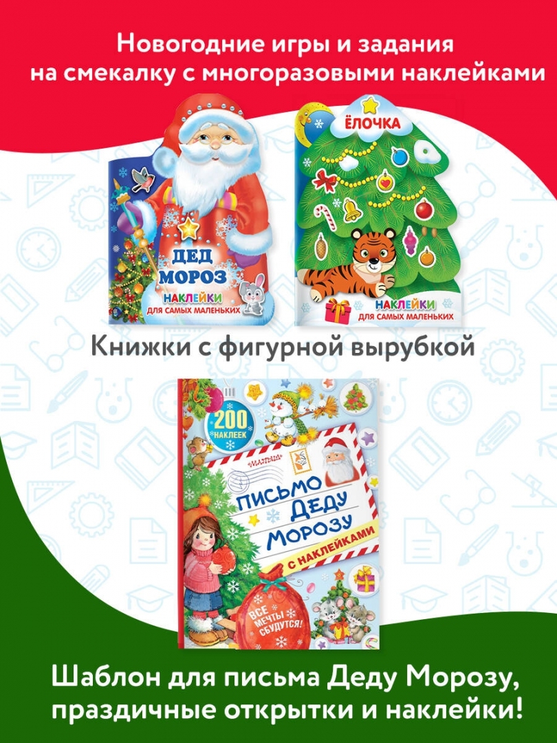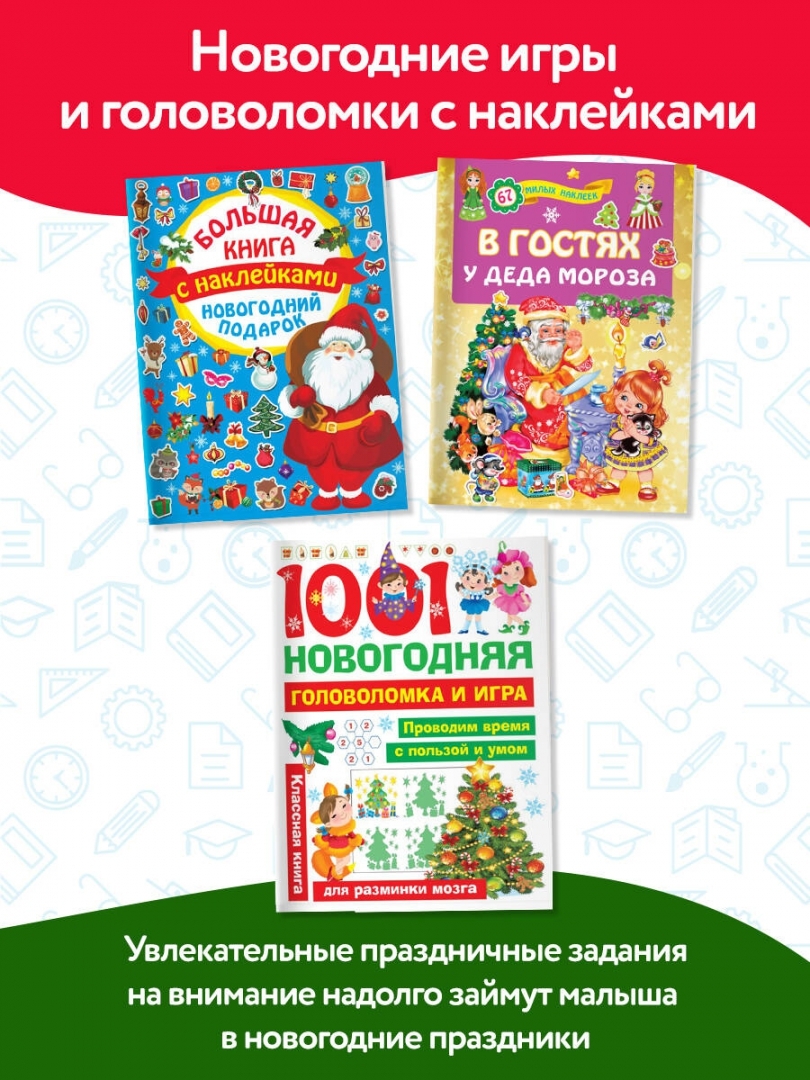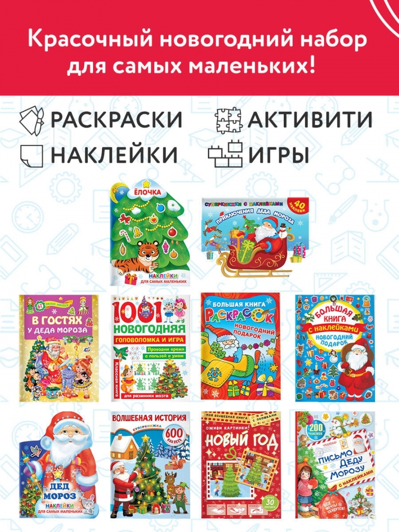 Большой новогодний подарок ребёнку – комплект из 10 книг, которые помогут организовать увлекательные домашние занятия с ребёнком в течение всех новогодних праздников. В комплекте – развивающие издания для весёлого и полезного досуга малыша: новогодние сказки, шаблоны для писем Деду Морозу, объёмные поделки, вырезалки-оригами с зимними сюжетами, игры с наклейками, головоломки, лабиринты и, конечно, новогодние раскраски! – книги с большим выбором интересных и полезных заданий, которые надолго займут малыша.