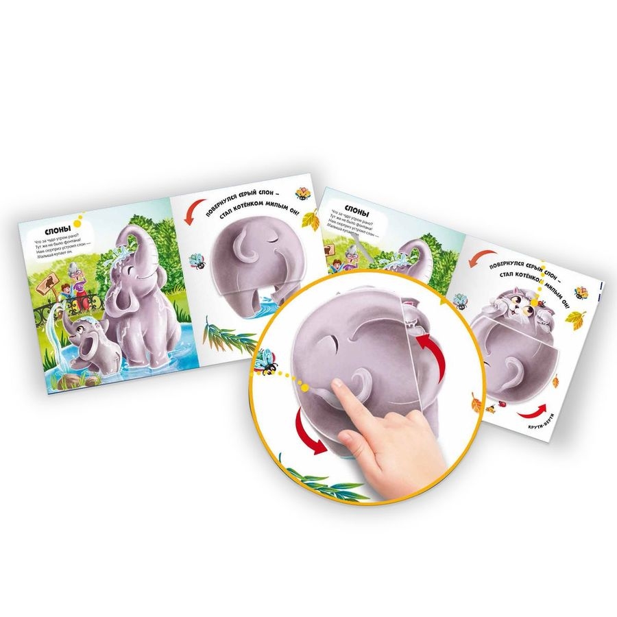 Перед вами книга-игра! Внутри неё не простые картинки, а их чудесные превращения! Стоит только покрутить подвижную деталь, как лев превратится в орангутана, лама – в собаку, а слон – в котёнка. Интересно? Тогда открывай книжку, читай весёлые стихи и стань настоящим фокусником!