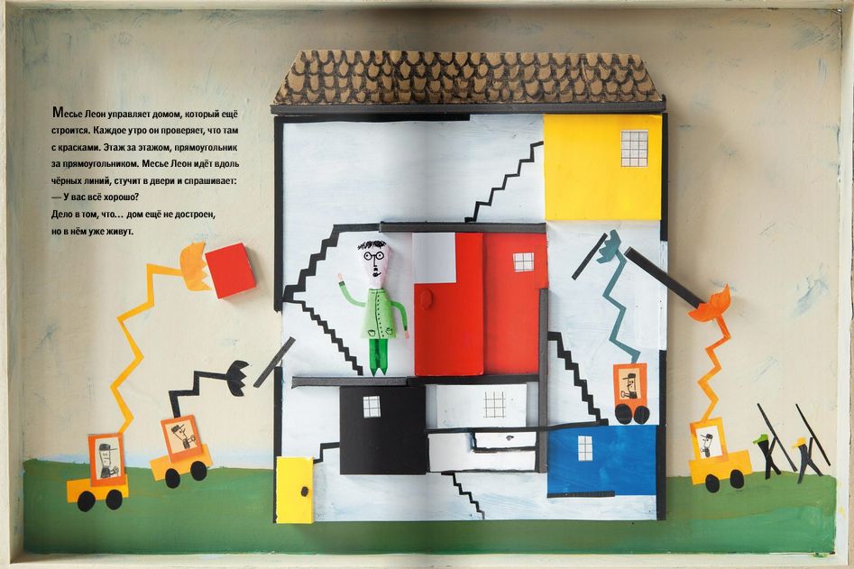Месье Леон управляет домом, который ещё строится. Каждое утро он проверяет, что там с красками. Этаж за этажом, прямоугольник за прямоугольником. Месье Леон идёт вдоль чёрных линий, стучит в двери и спрашивает:
