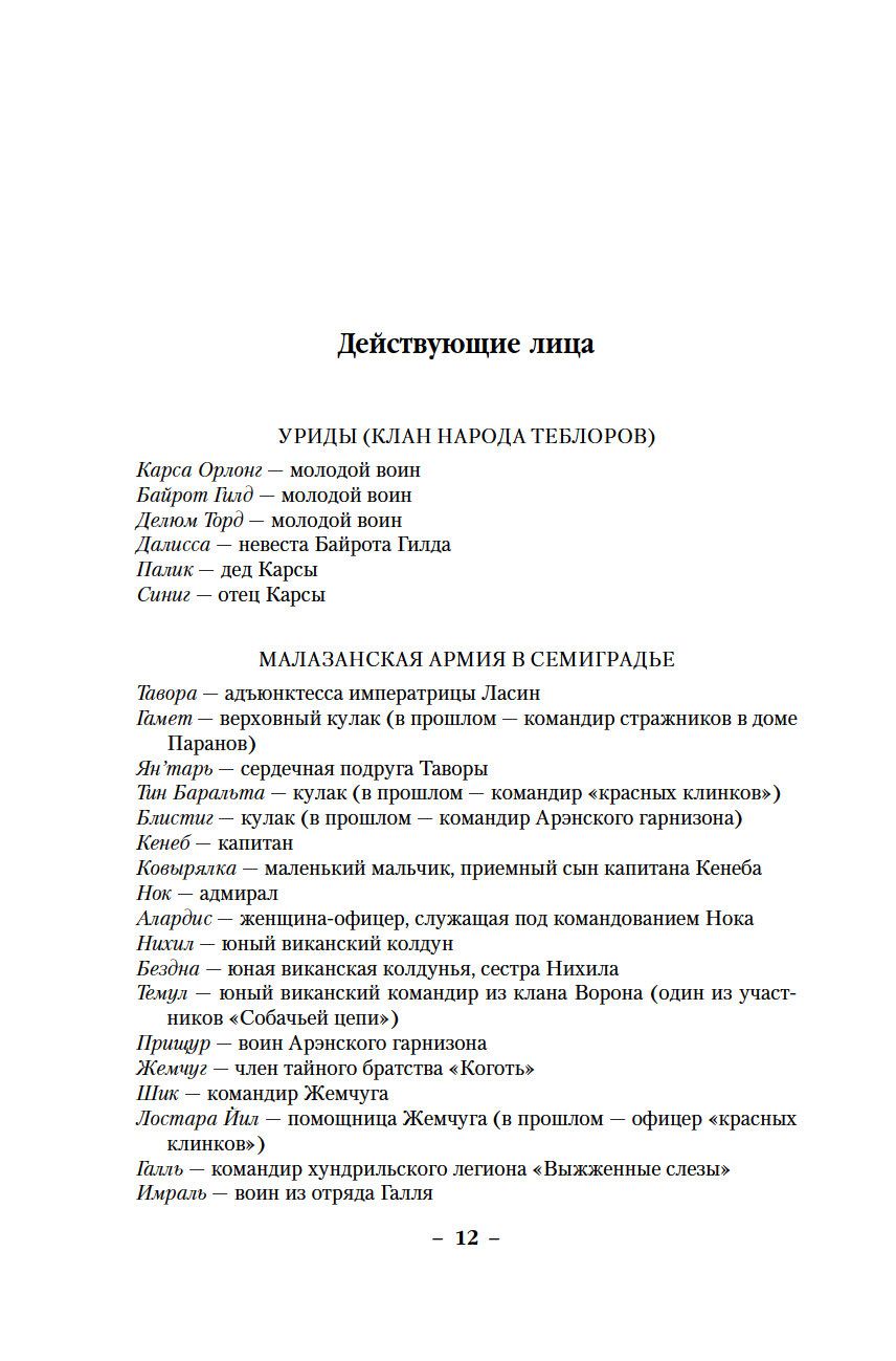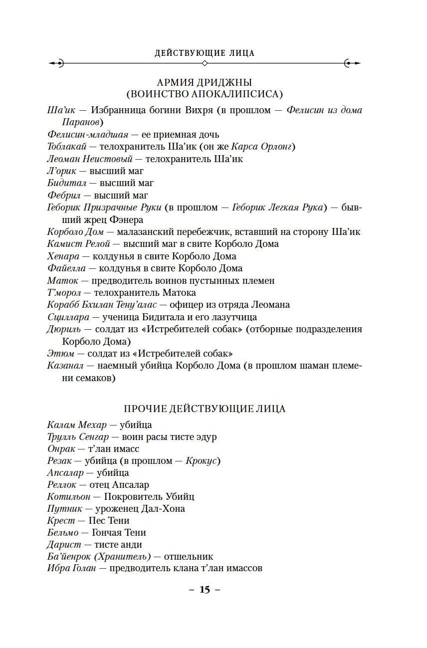 Семиградье, некогда оккупированное Малазанской империей и попавшее к ней под пяту, восстало. Само существование империи под угрозой. Императрица Ласин карательными мерами пытается подавить мятеж. Воинство Апокалипсиса – Вихрь Дриджны, – сосредоточенное в священной пустыне Рараку, во главе с Ша'ик Возрожденной, ведет свою двойную игру. В стане семиградских мятежников также нет единства и понимания: маги, пустынные племена, перебежчик Корболо Дом – все хотят переиграть ситуацию в свою пользу. Цепь судеб и обстоятельств, которая сковывает людей, вот-вот оборвется. Чем это закончится для планеты? Чередой новых несчастий? Миром? Покоем? Ответа нет...