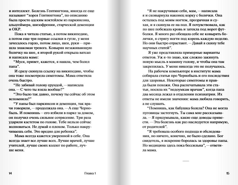 Марина узнает о том, что ее отец, радиобиолог, тестировавший почву после аварии на Чернобыльской АЭС, умер от редкого заболевания – хореи Гентингтона. Будучи беременной и панически боясь передать хорею по наследству своему сыну, она рассуждает о восприятии себя как матери, переосмысливает роль отца в своей жизни и историю их взаимного отчуждения. Пытаясь понять, каким человеком был отец, Марина затрагивает темы ценности человеческой жизни в Советском Союзе, непроговоренности семейных травм и стыда за своих близких.