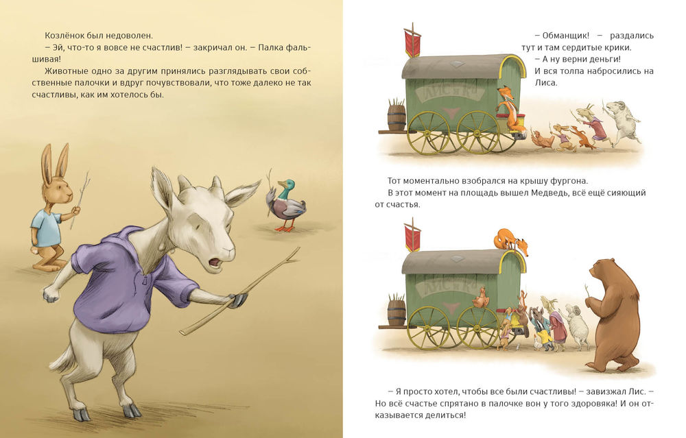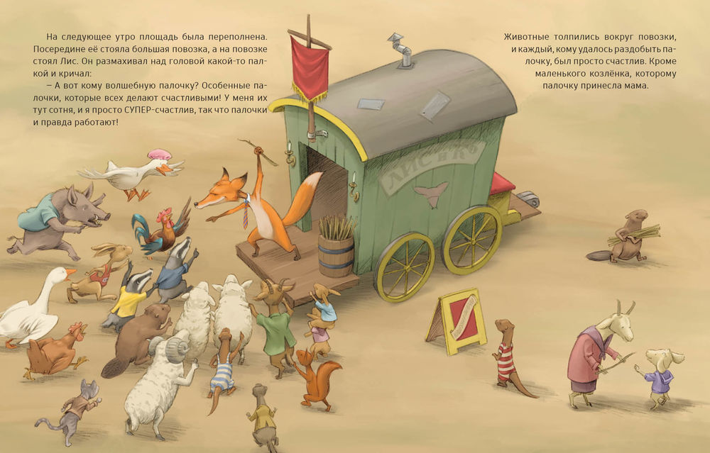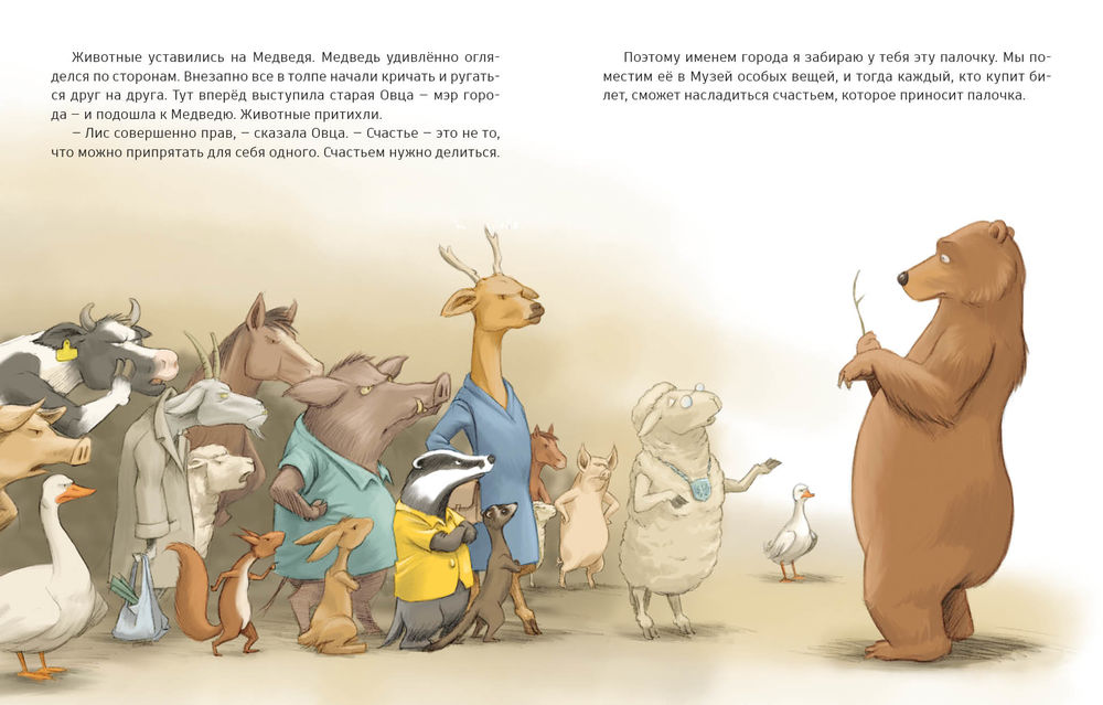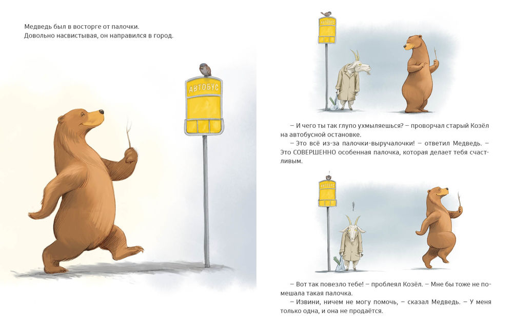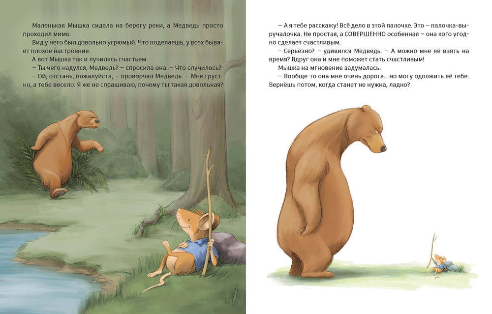 Встретились однажды очень грустный Медведь и очень счастливая Мышка. Почему же Мышка была так счастлива? Оказалось, что всё дело в СОВЕРШЕННО особенной палочке, которая делает своего обладателя счастливым. Мышке стало жаль Медведя, и она одолжила ему палочку. И тут началось такое!!! Ведь волшебная палочка понадобилась сразу всем зверям в городе?