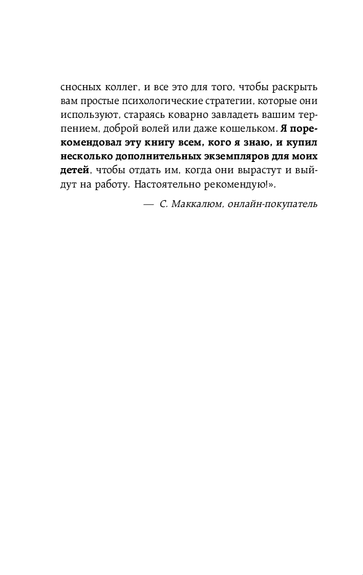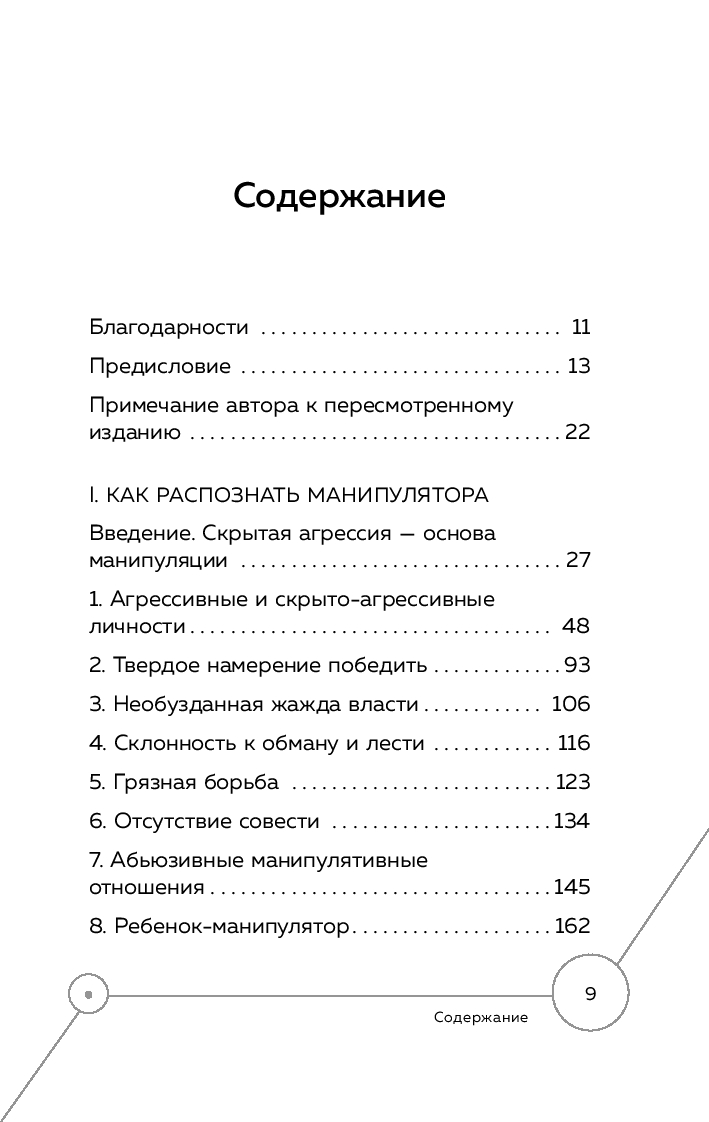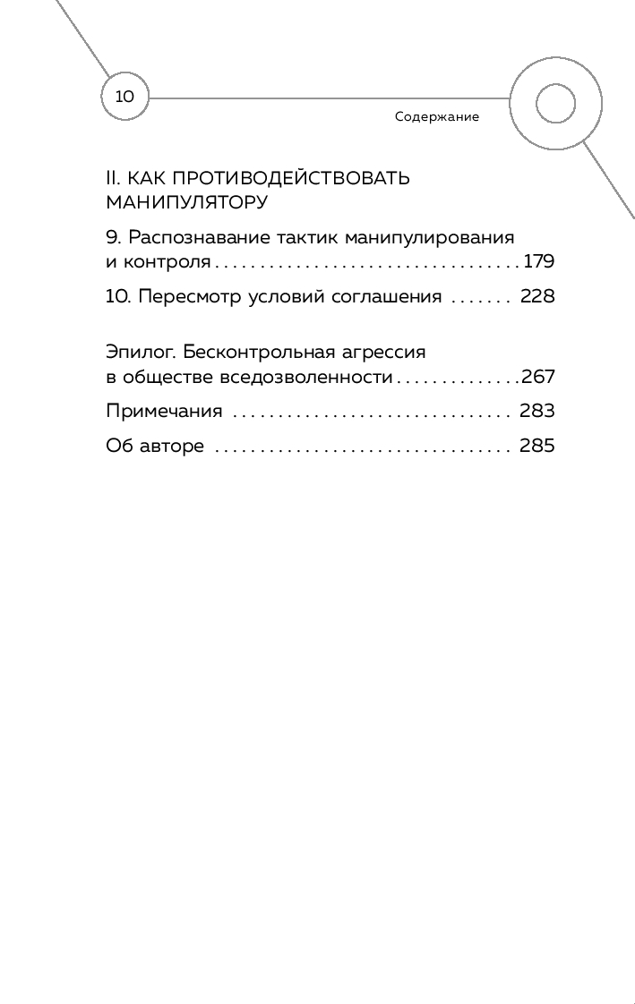 В этой книге автор познакомит вас с новым способом – как раскрыть сущность манипулятивных людей. Он объяснит, что такое скрытая агрессия и почему она лежит в основе большинства межличностных манипуляций. Джордж Саймон уделил особое внимание тем аспектам личности, которые слишком часто игнорируются традиционными взглядами. И пусть не все продвигаемые идеи совпадают с общепринятыми предположениями о мотивах и поведении скрыто-агрессивных людей, они объясняют, почему некоторые из самых распространенных представлений о человеческой природе делают нас удобными жертвами манипуляторов.