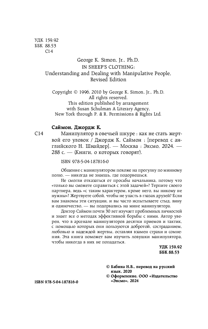 | Название в оригинале | In Sheep’s Clothing: Understanding and Dealing with Manipulative People, Revised Edition |