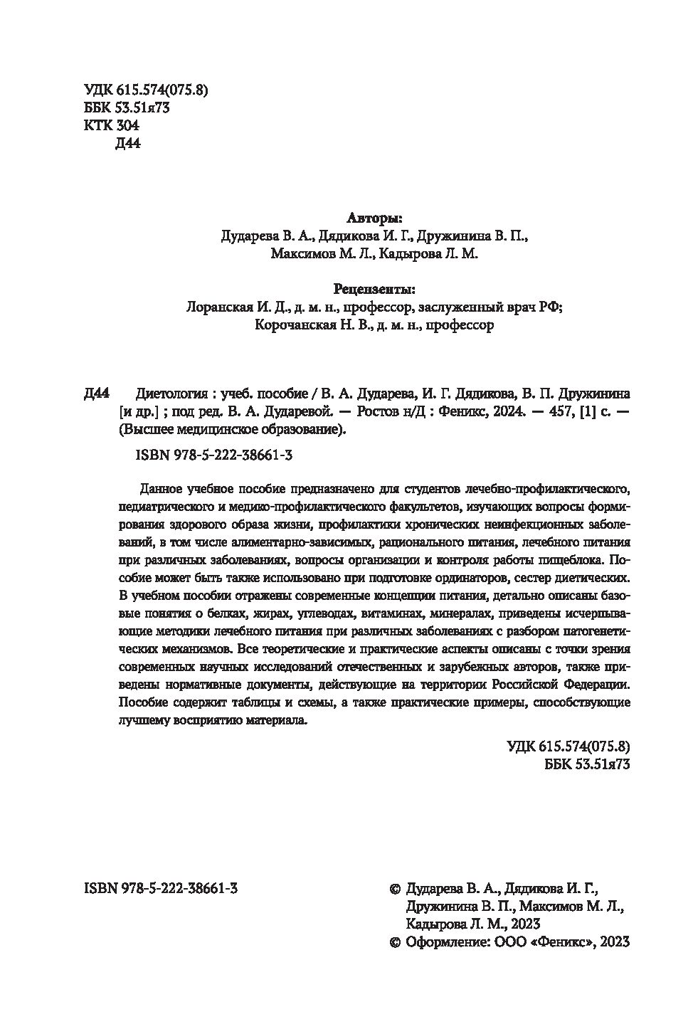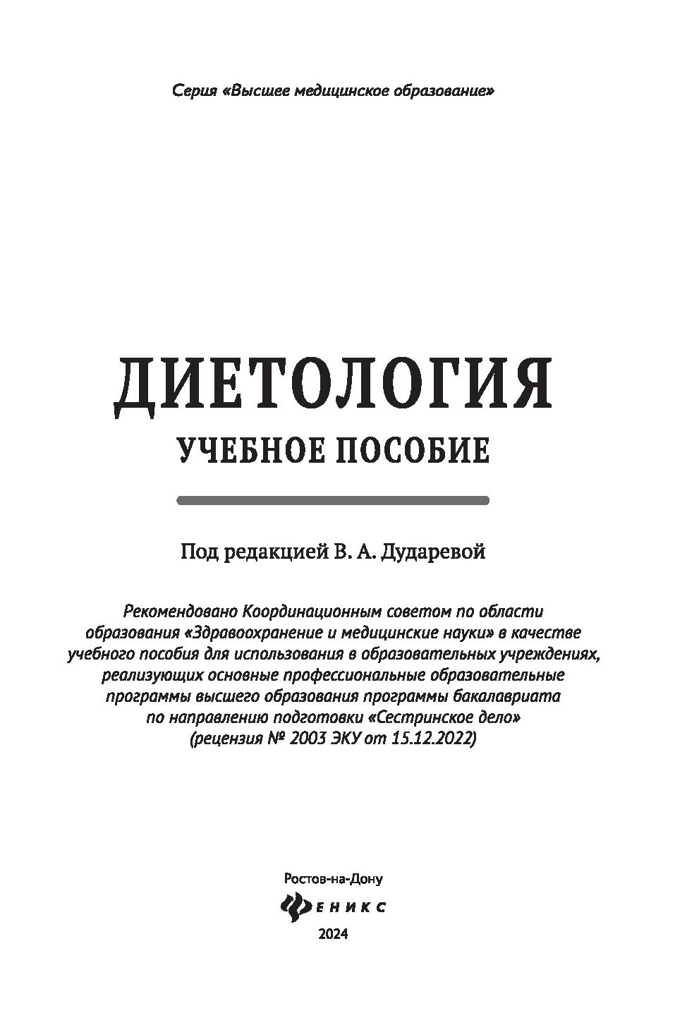 Данное учебное пособие предназначено для студентов лечебно-профилактического, педиатрического и медико-профилактического факультетов, изучающих вопросы формирования здорового образа жизни, профилактики хронических неинфекционных заболеваний, в том числе алиментарно-зависимых, рационального питания, лечебного питания при различных заболеваниях, вопросы организации и контроля работы пищеблока. Пособие может быть также использовано при подготовке ординаторов, сестер диетических. В учебном пособии отражены современные концепции питания, детально описаны базовые понятия о белках, жирах, углеводах, витаминах, минералах, приведены исчерпывающие методики лечебного питания при различных заболеваниях с разбором патогенетических механизмов. Все теоретические и практические аспекты описаны с точки зрения современных научных исследований отечественных и зарубежных авторов, также приведены нормативные документы, действующие на территории Российской Федерации. Пособие содержит таблицы и схемы, а также практические примеры, способствующие лучшему восприятию материала.