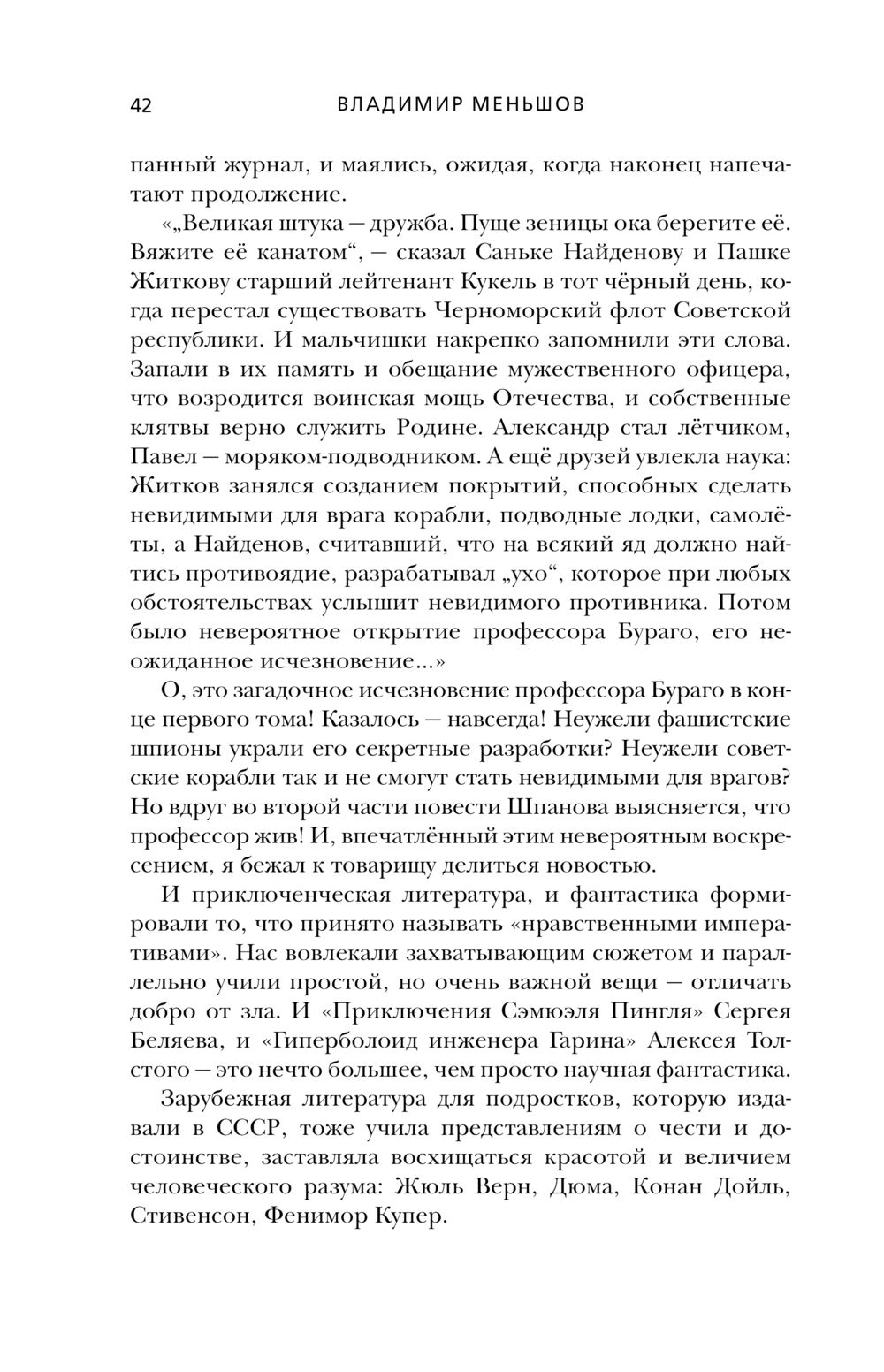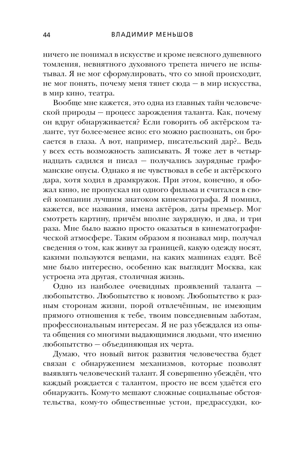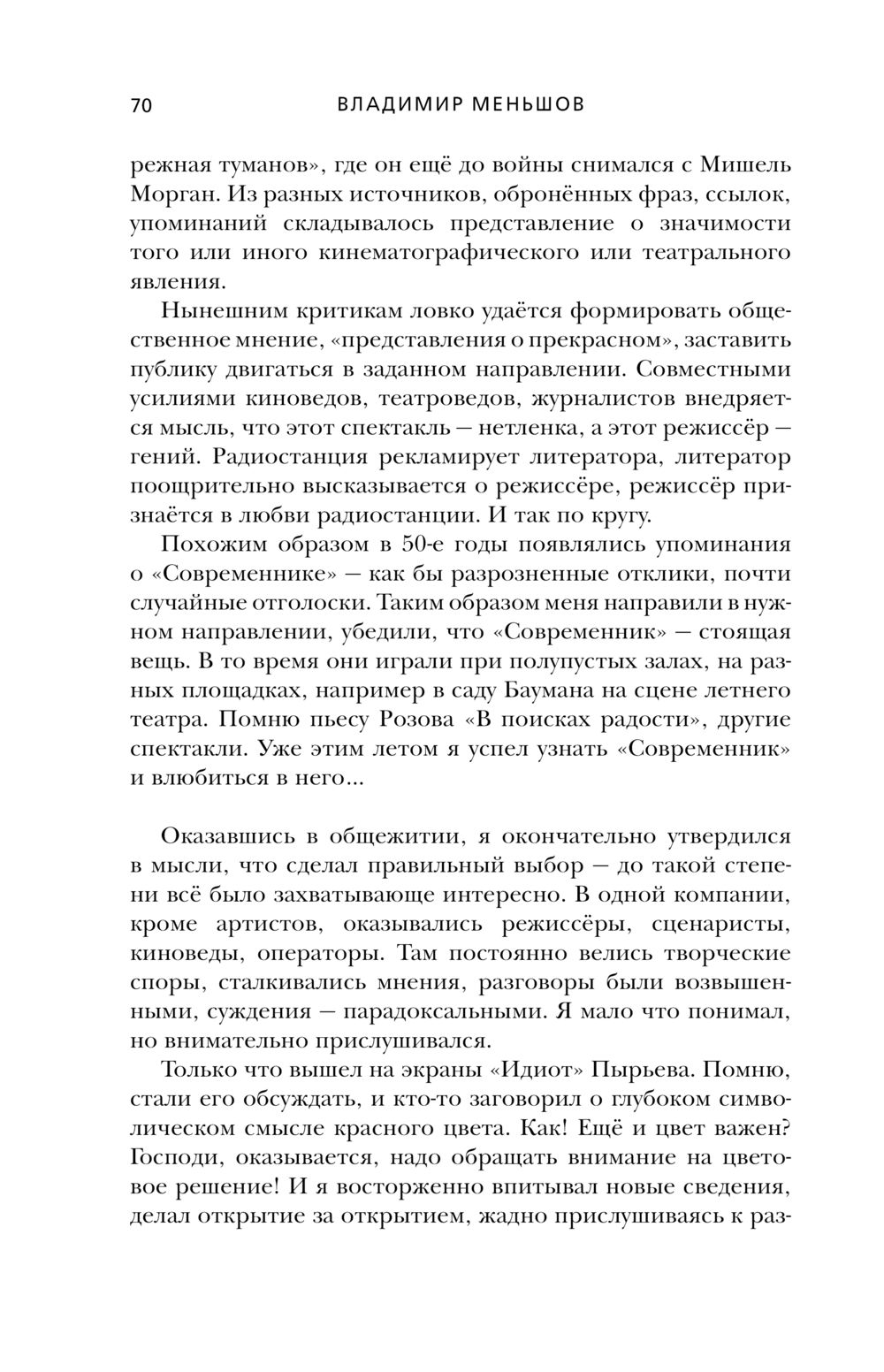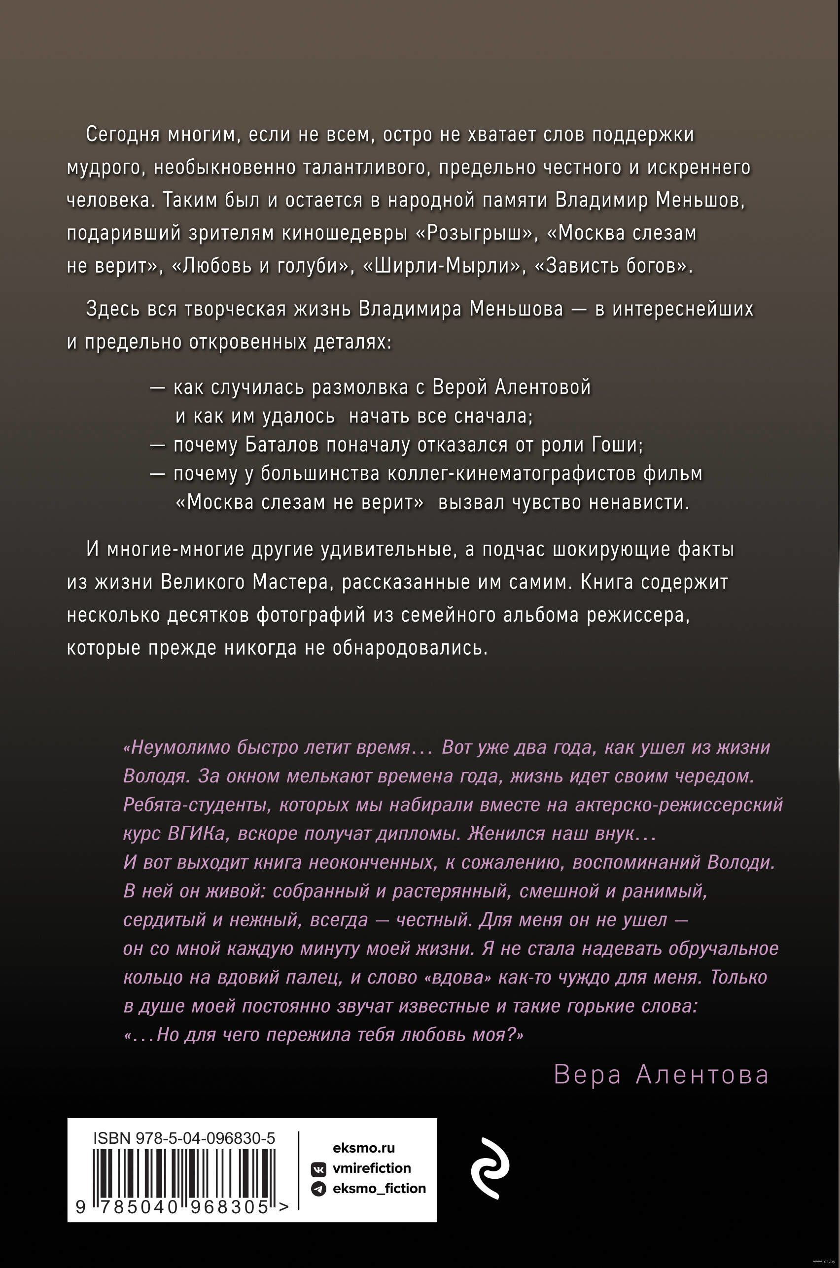 Это очень своевременная книга. Сегодня многим, если не всем, остро не хватает слов поддержки мудрого, необыкновенно талантливого, предельно честного и искреннего человека. Таким был и остается в народной памяти Владимир Меньшов, подаривший зрителям киношедевры "Розыгрыш", "Москва слезам не верит", "Любовь и голуби", "Ширли-Мырли", "Зависть богов".