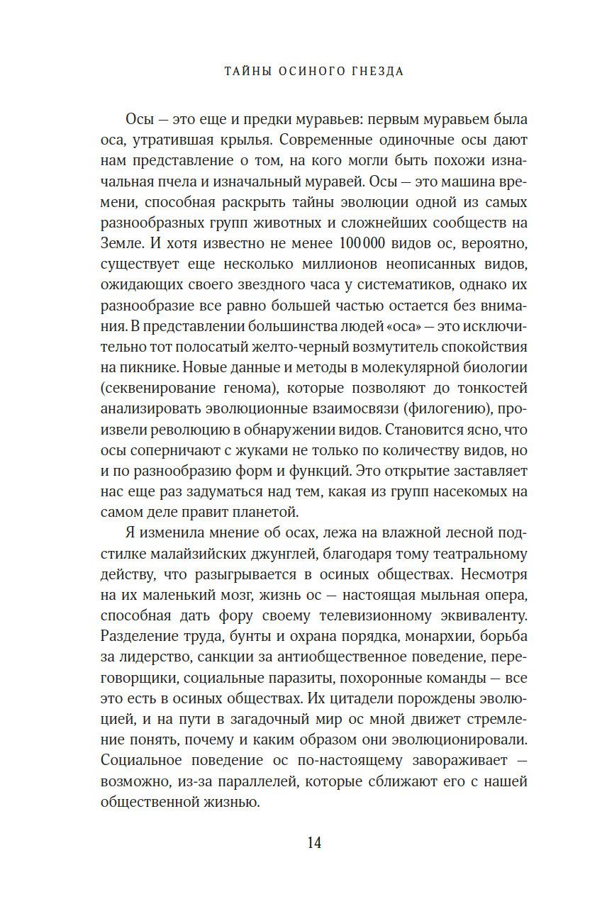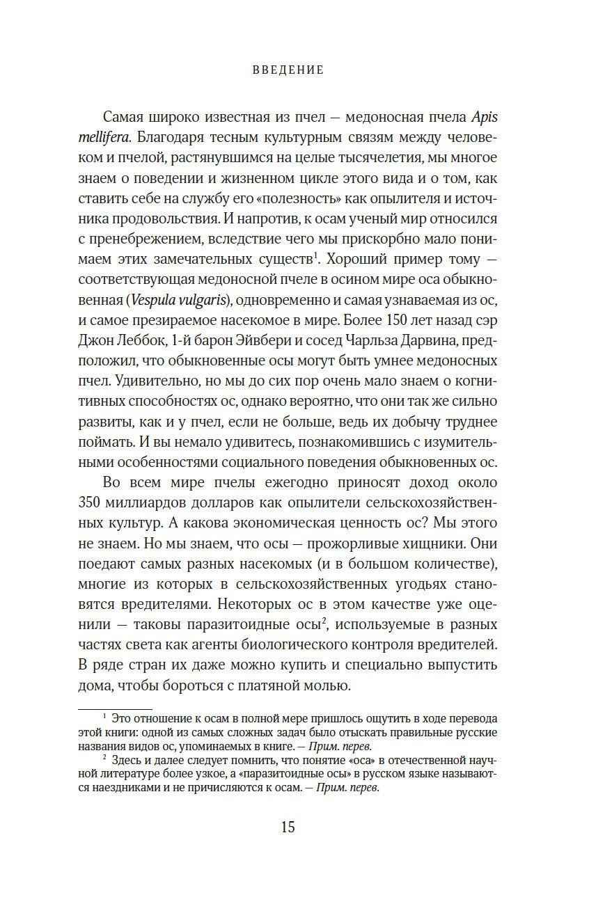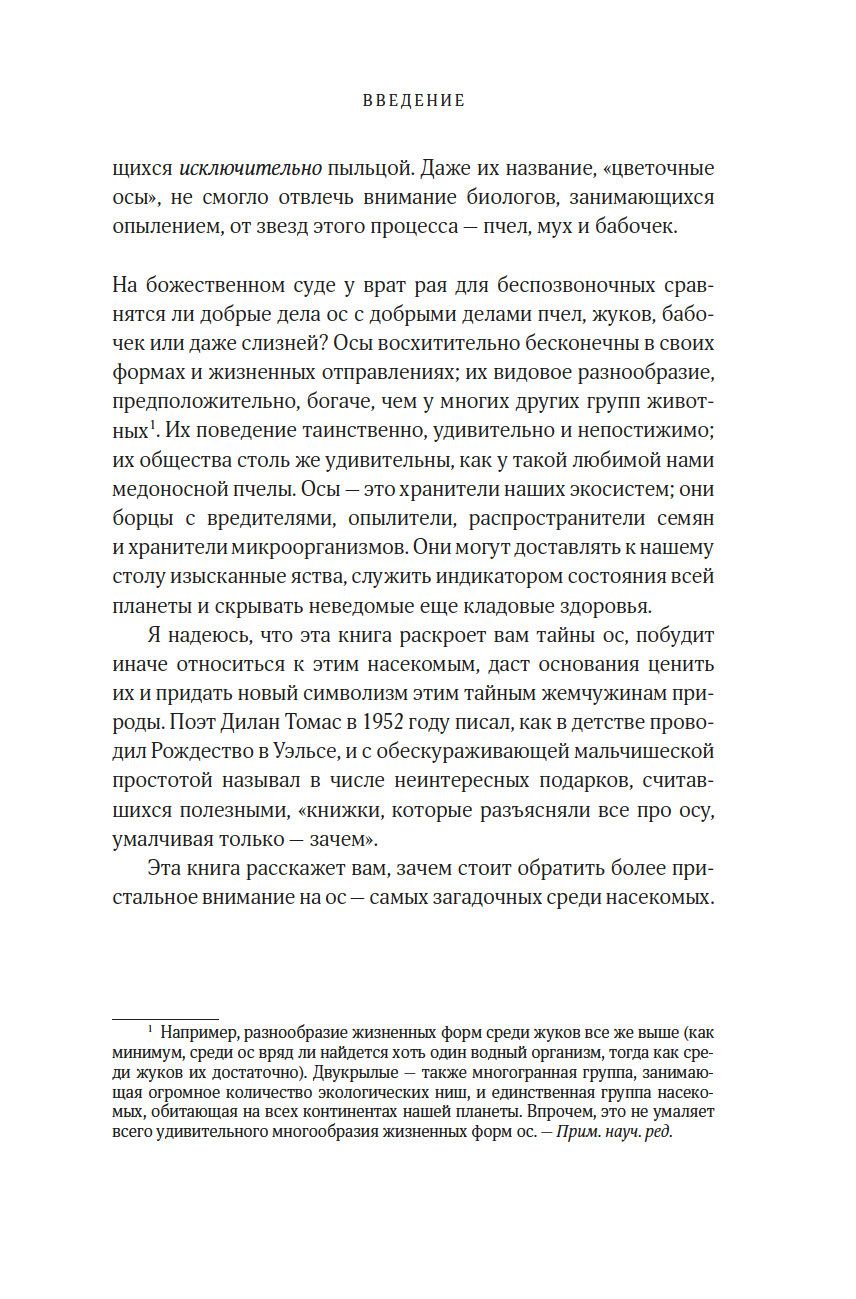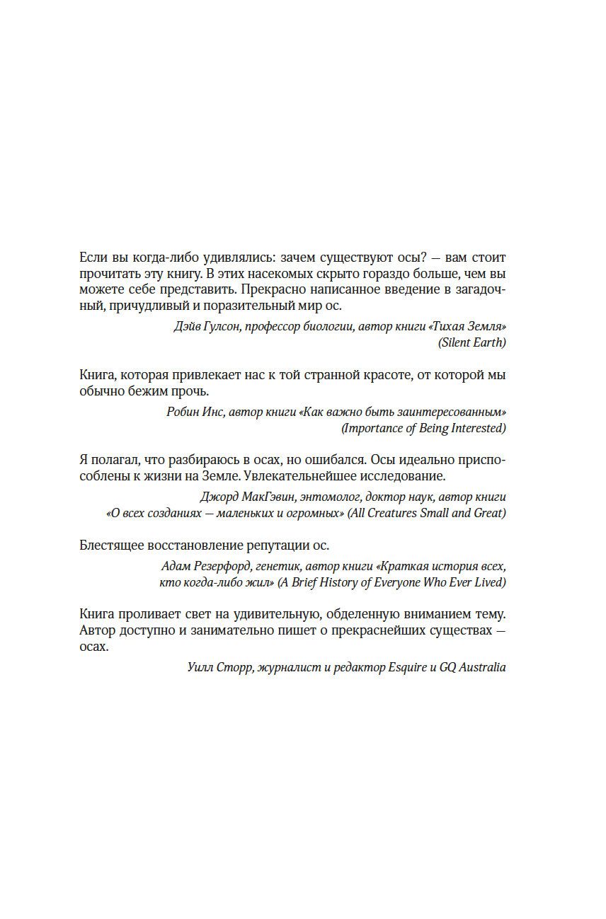 "Осы – одна из самых таинственных и обделенных вниманием жемчужин природы. Бесконечное множество их форм демонстрирует нам одно из самых непредсказуемых и впечатляющих достижений эволюции. Их жизнь тесно переплетена с жизнью других насекомых, а также грибов, бактерий, растений, почвы, экосистем и даже нас с вами. Цель этой книги – усадить ос за почетный стол природы и превратить жуткое отвращение, которое испытывают люди к осам, в восхищение и уважение, каких осы заслуживают". (Сейриан Самнер)