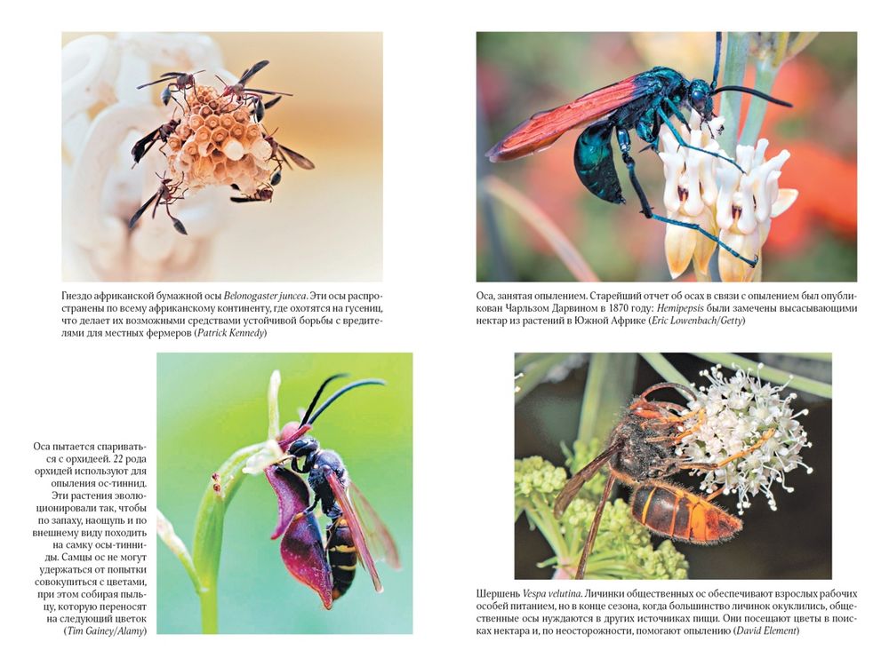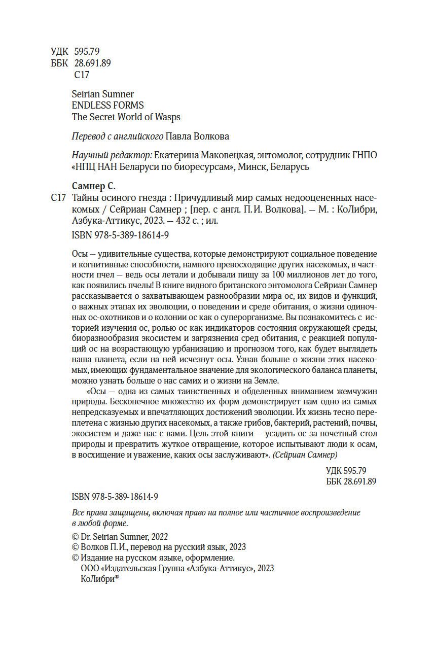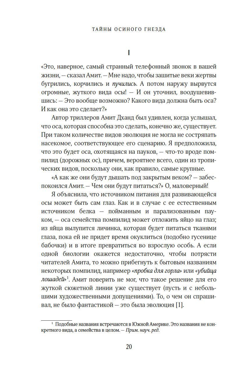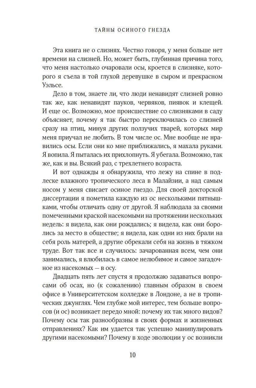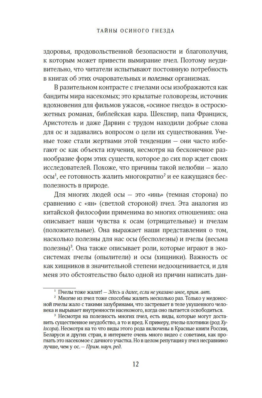 "Осы – одна из самых таинственных и обделенных вниманием жемчужин природы. Бесконечное множество их форм демонстрирует нам одно из самых непредсказуемых и впечатляющих достижений эволюции. Их жизнь тесно переплетена с жизнью других насекомых, а также грибов, бактерий, растений, почвы, экосистем и даже нас с вами. Цель этой книги – усадить ос за почетный стол природы и превратить жуткое отвращение, которое испытывают люди к осам, в восхищение и уважение, каких осы заслуживают". (Сейриан Самнер)