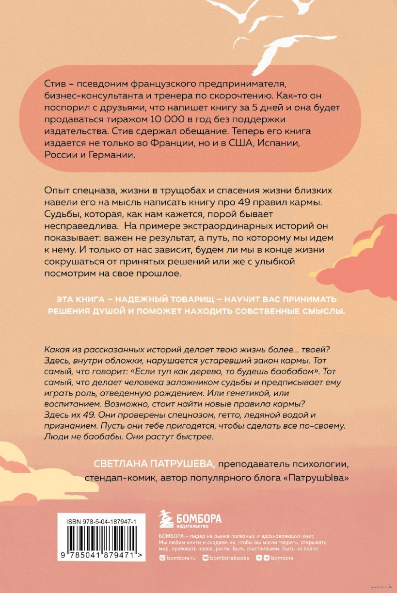 Опыт спецназа, жизни в трущобах и спасения жизни близких навели его на мысль написать книгу про 49 правил Кармы. Судьбы, которая, как нам кажется, порой бывает несправедлива. На примере экстраординарных историй он показывает: важен не результат, а путь, по которому мы идем к нему. И только от нас зависит, будем ли мы в конце жизни сокрушаться от принятых решений или же с улыбкой посмотрим на свое прошлое.