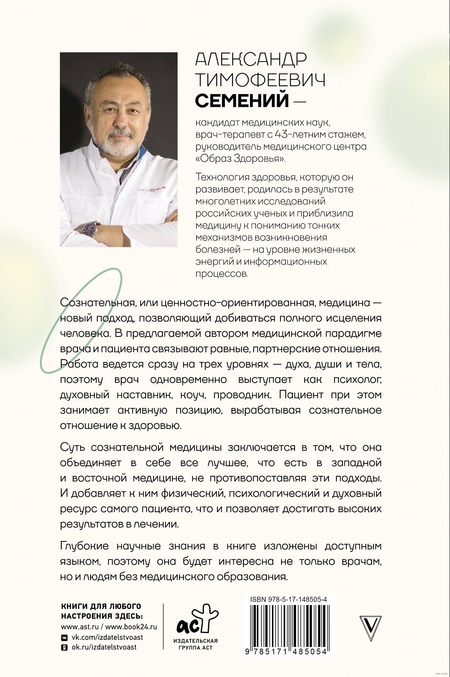 Сознательная, или ценностно-ориентированная медицина – новый подход, позволяющий добиваться полного исцеления человека. В предлагаемой автором медицинской парадигме врача и пациента связывают равные, партнерские отношения. Работа ведется сразу на трех уровнях – духа, души и тела, поэтому врач одновременно выступает как психолог, духовный наставник, коуч, проводник. Пациент при этом занимает активную позицию, вырабатывая сознательное отношение к здоровью.