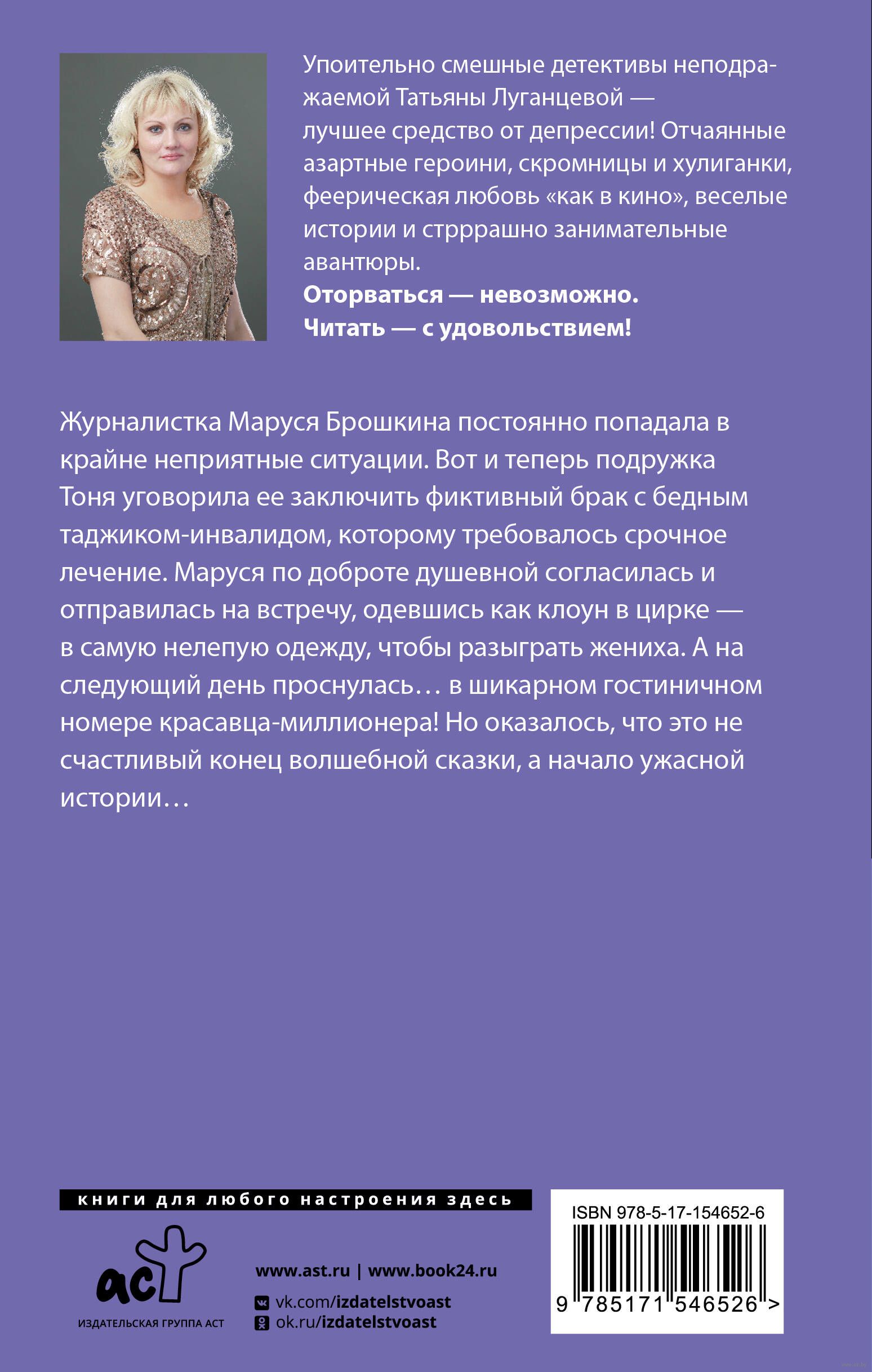 Журналистка Маруся Брошкина постоянно попадала в крайне неприятные ситуации. Вот и теперь подружка Тоня уговорила ее заключить фиктивный брак с бедным таджиком-инвалидом, которому требовалось срочное лечение. Маруся по доброте душевной согласилась и отправилась на встречу, одевшись как клоун в цирке – в самую нелепую одежду, чтобы разыграть жениха. А на следующий день проснулась... в шикарном гостиничном номере красавца-миллионера! Но оказалось, что это не счастливый конец волшебной сказки, а начало ужасной истории...
