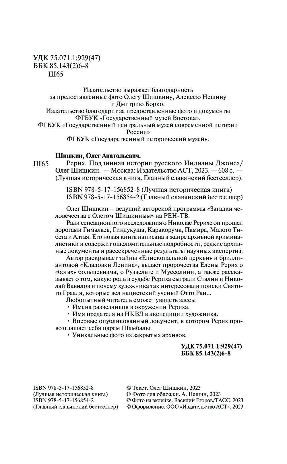 Олег Шишкин – ведущий авторской программы "Загадки человечества с Олегом Шишкиным" на РЕН-ТВ. Ради сенсационного исследования о Николае Рерихе он прошел дорогами Гималаев, Гиндукуша, Каракорума, Памира, Малого Тибета и Алтая. Его новая книга написана в жанре архивной криминалистики и содержит ошеломительные подробности, редкие архивные документы и рассекреченные результаты научных экспертиз. Автор раскрывает тайны "Епископальной церкви" и бриллиантовой "Кладовки Ленина", выдает пророчества Елены Рерих о "богах" большевизма, о Рузвельте и Муссолини, а также рассказывает о том, какую роль в судьбе Рериха сыграли Сталин и Николай Вавилов и почему художника так интересовали поиски Святого Грааля, которые вел нацистский ученый Отто Ран...