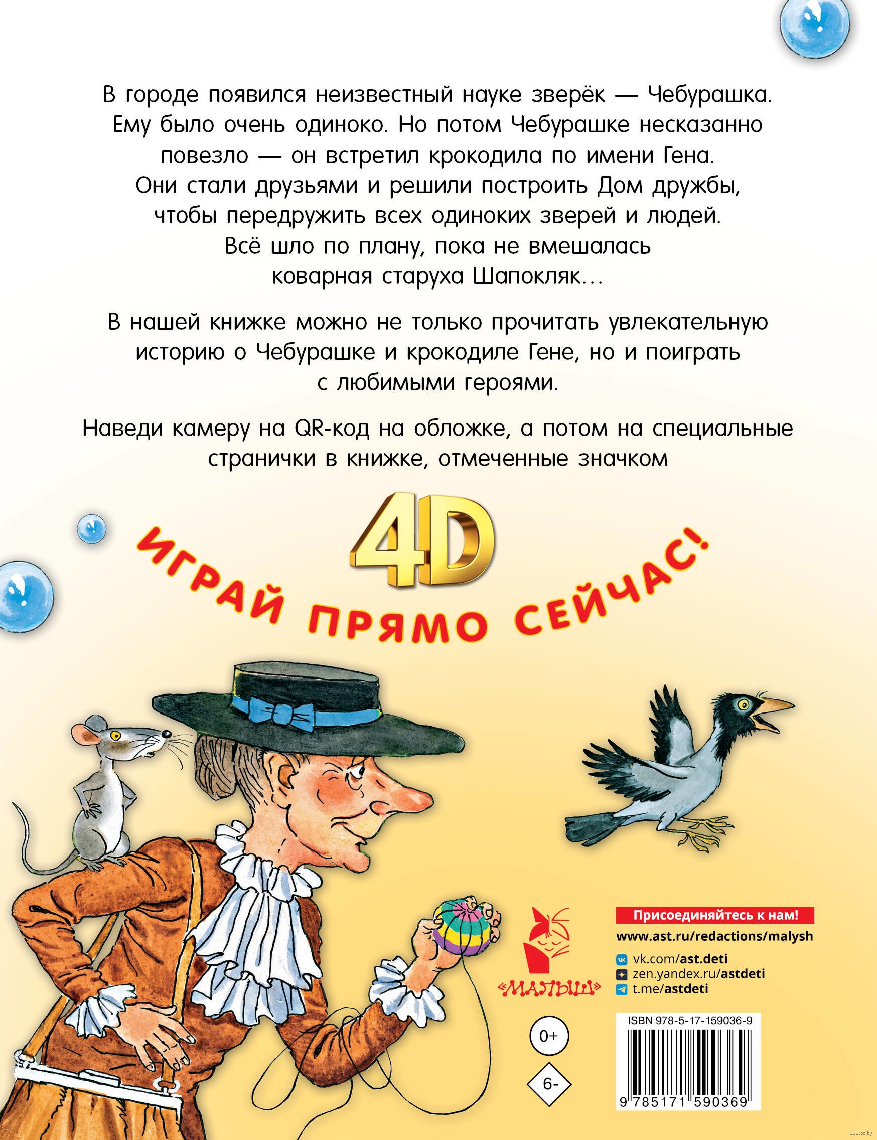 Любимых героев вы можете увидеть не только в мультфильмах, но и у себя дома. Перед вами необычная книжка! В нём волшебство 4Д. Теперь с Геной и Чебурашкой можно играть, петь песенки и справляться с проказами старухи Шапокляк.