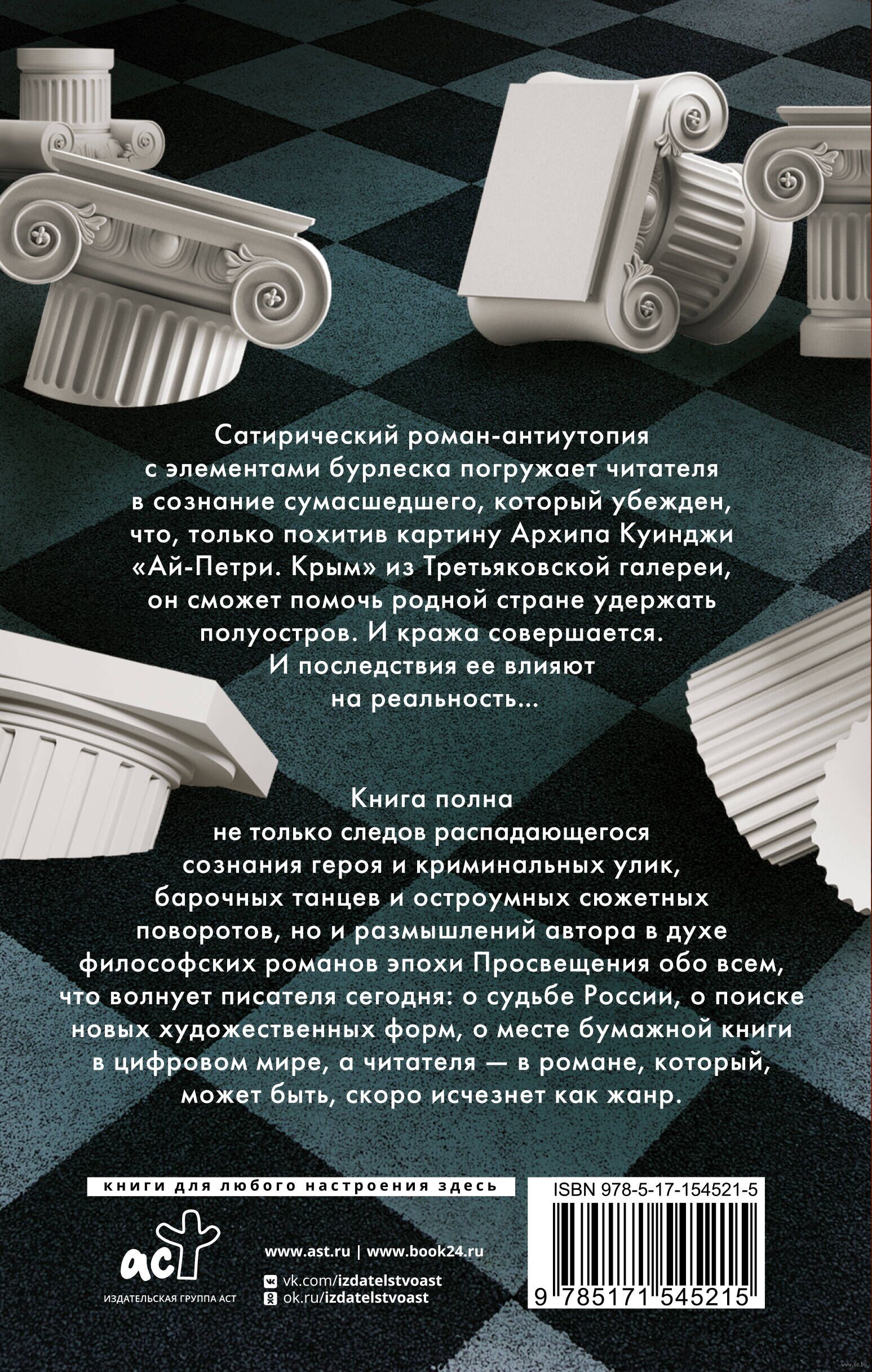 Сатирический роман-антиутопия с элементами бурлеска погружает читателя в сознание сумасшедшего, который убежден, что, только похитив картину Архипа Куинджи "Ай-Петри. Крым" из Третьяковской галереи, он сможет помочь родной стране удержать полуостров. И кража совершается. И последствия ее влияют на реальность...