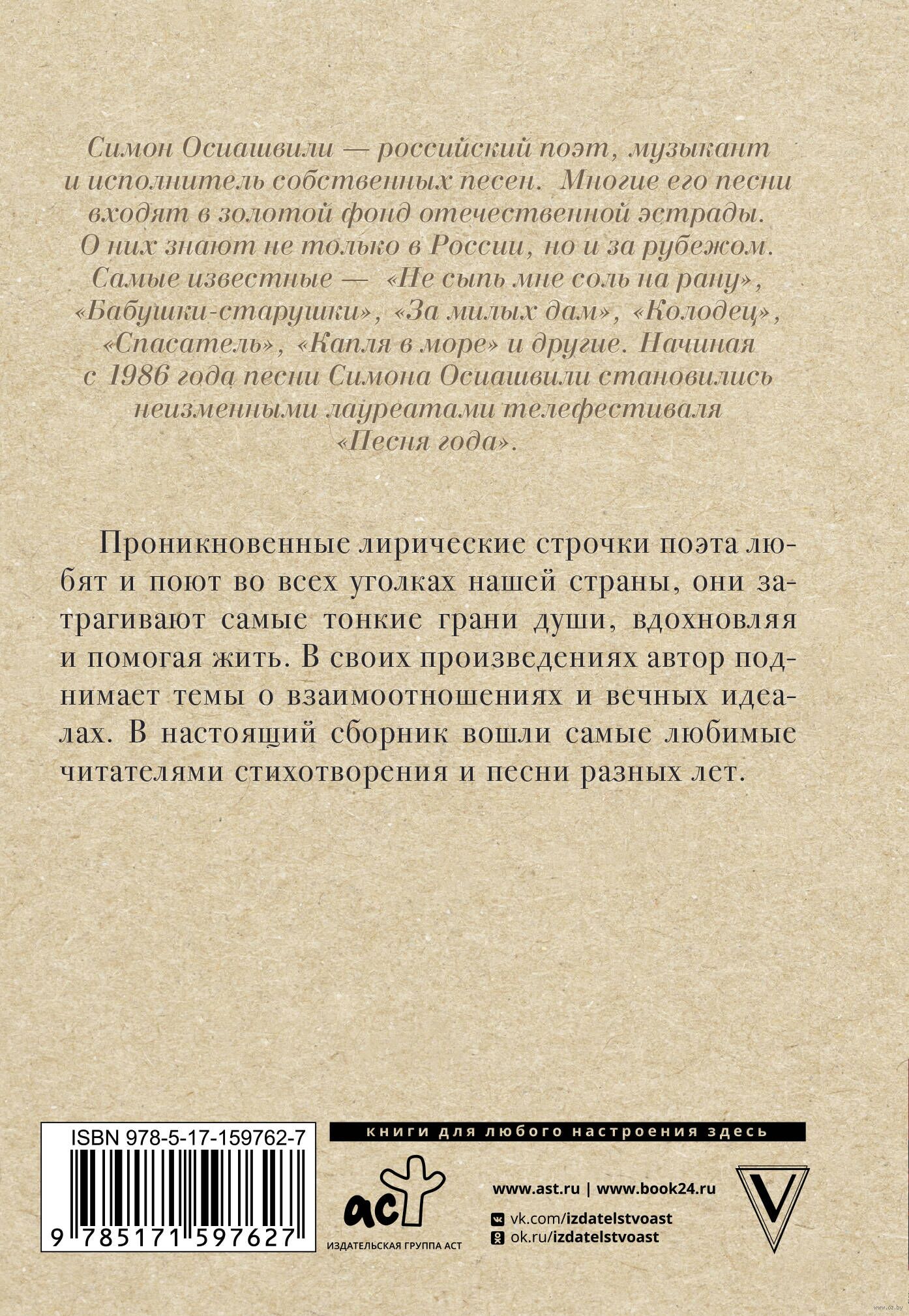 Проникновенные лирические строчки поэта любят и поют во всех уголках нашей страны, они затрагивают самые тонкие грани души, вдохновляя и помогая жить. В своих произведениях автор поднимает темы о взаимоотношениях и вечных идеалах. В настоящий сборник вошли самые любимые читателями стихотворения и песни разных лет.