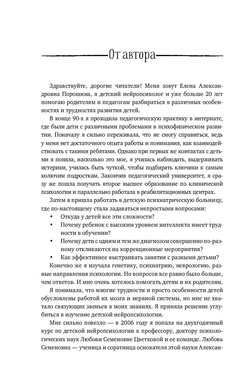 Порошина Елена Александровна – детский нейропсихолог, клинический психолог, кандидат психологических наук, автор обучающих программ для специалистов по детской нейропсихологии и психосоматике. Более 25 лет практической работы с детьми как с нормативной неравномерностью, так и с особенностями психофизического развития. Результатом личного опыта и стала данная книга.