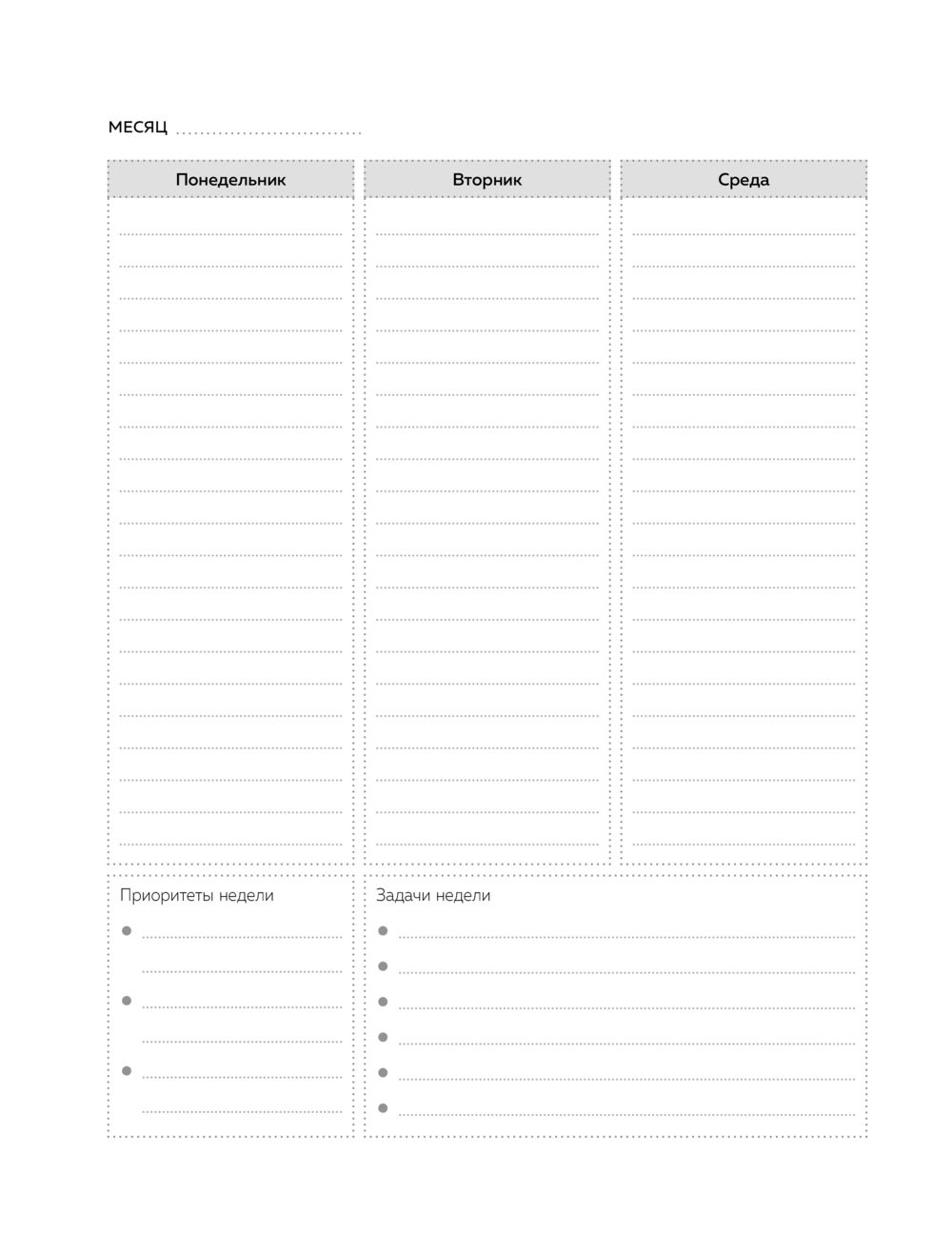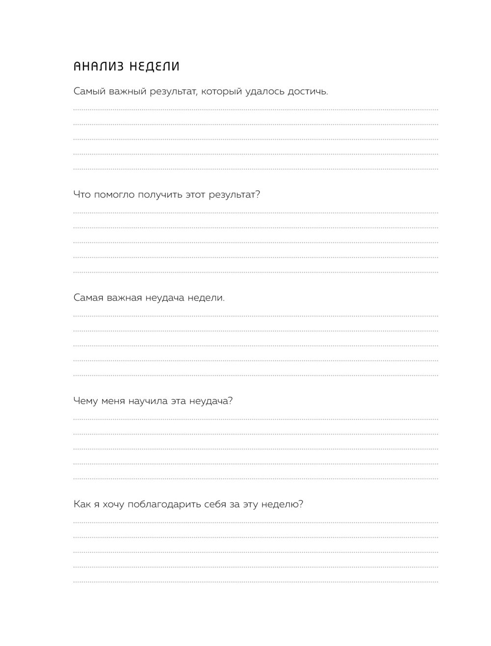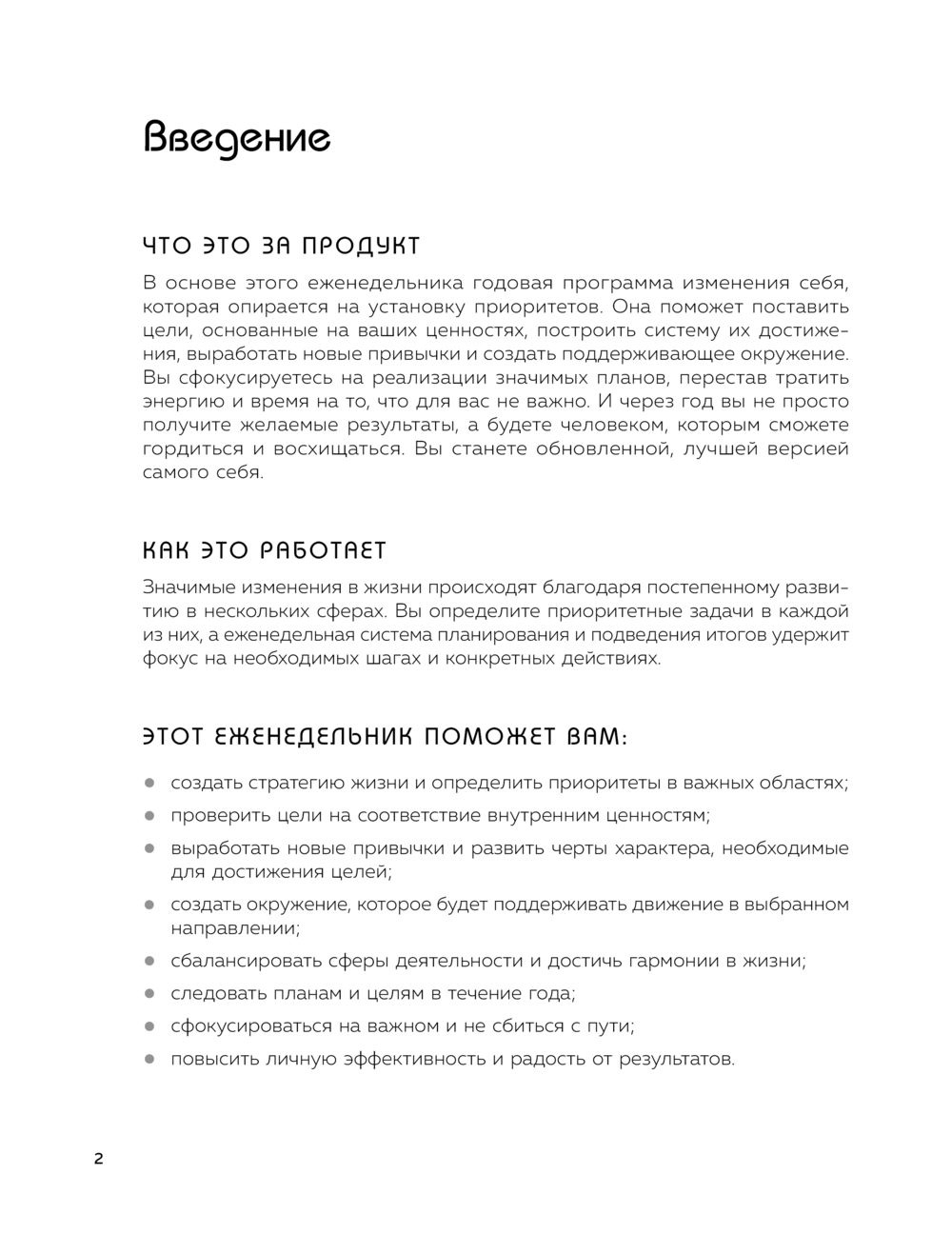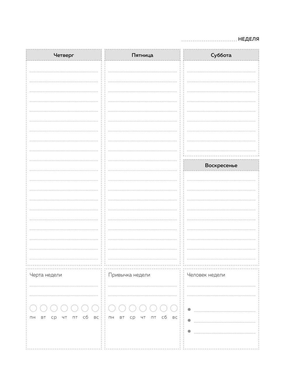 Этот еженедельник – программа полного преображения жизни за 52 недели с помощью постановки приоритетов. Он помогает сфокусировать усилия на главных задачах и навести порядок во всех жизненных сферах. Содержит трекеры привычек, поля для проработки целей на неделю, квартал и год, структурирующие списки и формы для анализа минувшего периода.