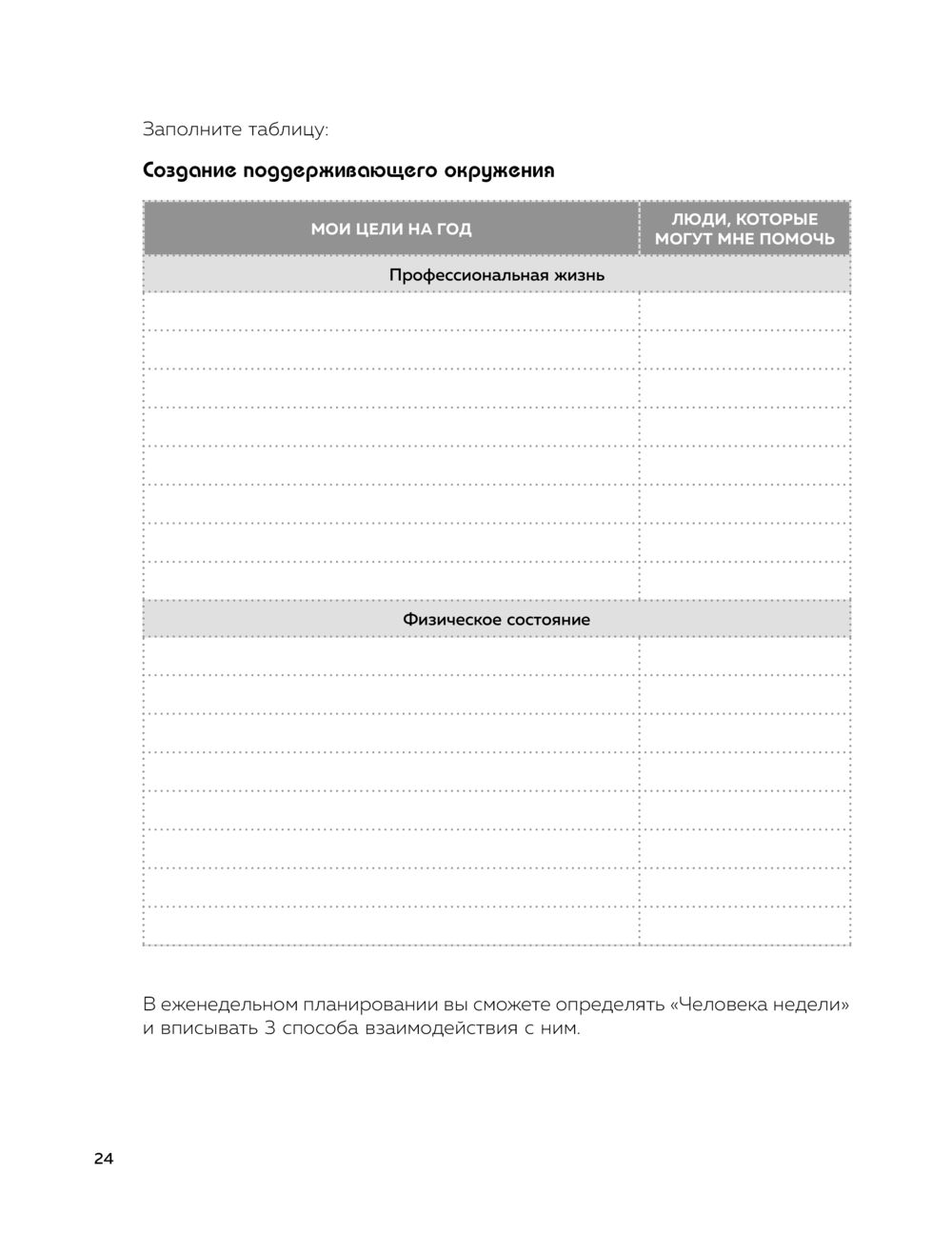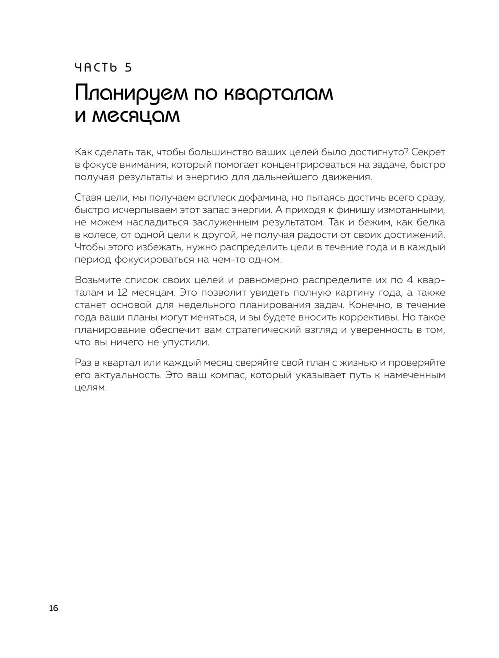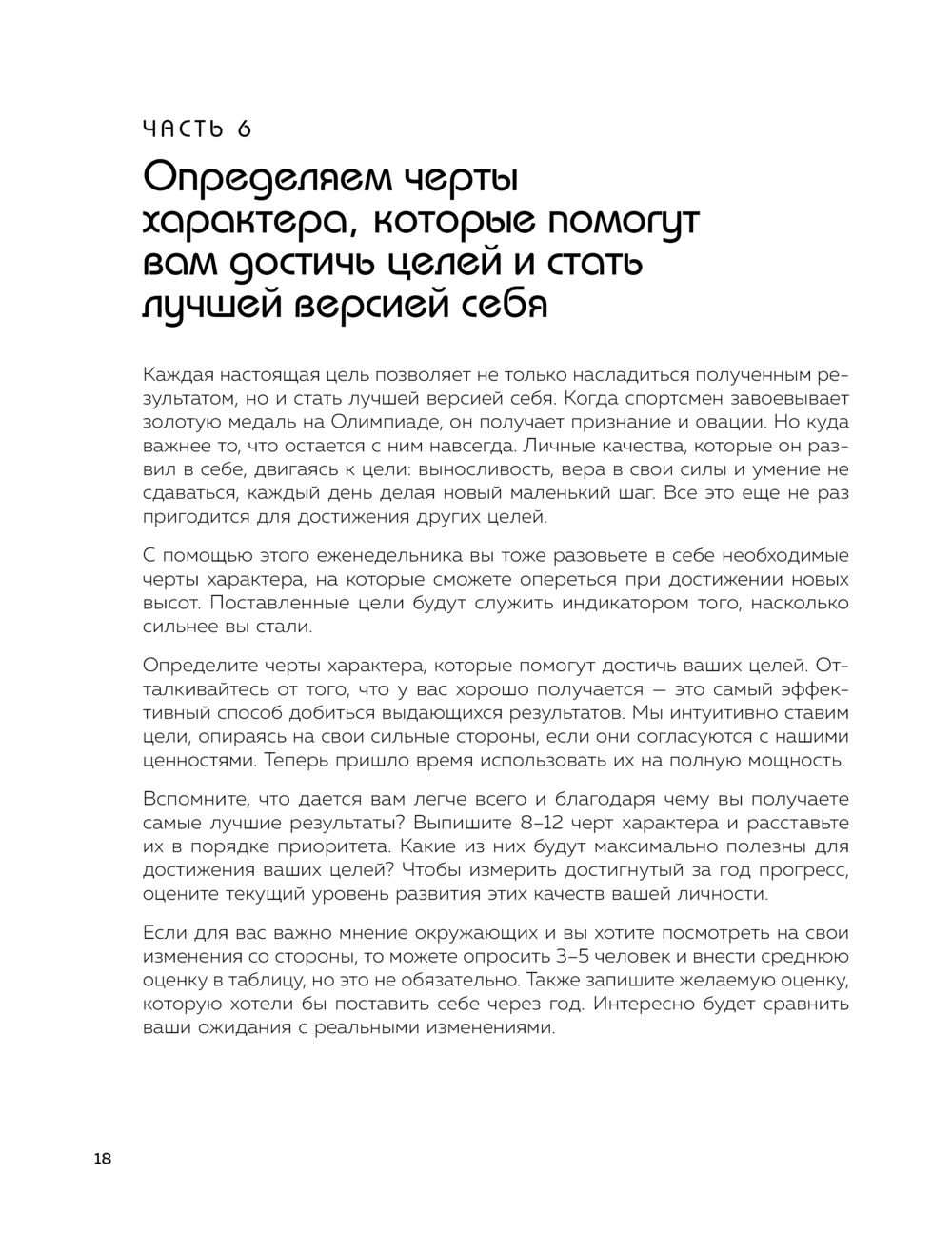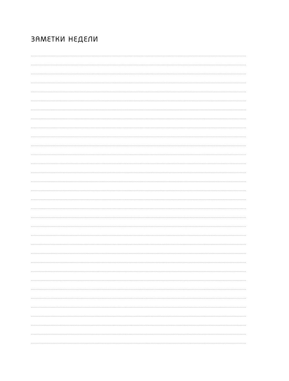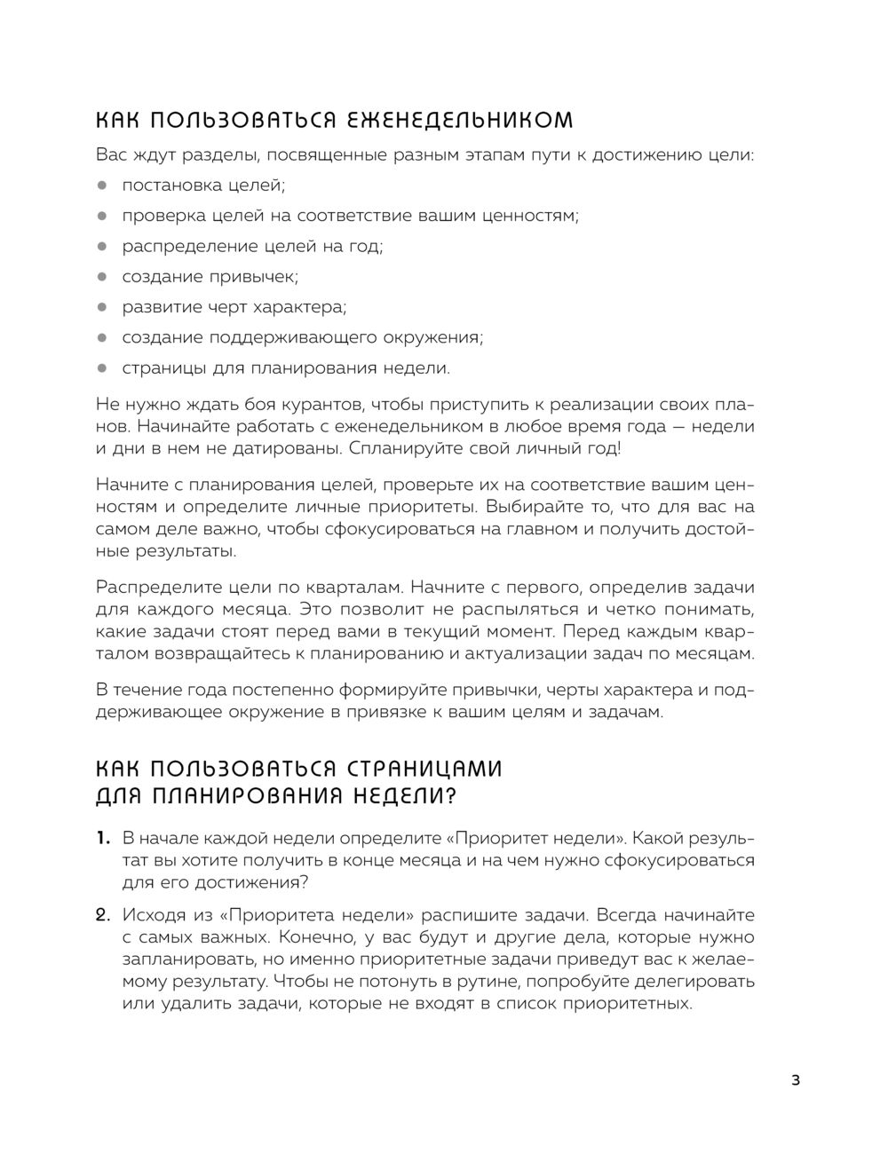 Этот еженедельник – программа полного преображения жизни за 52 недели с помощью постановки приоритетов. Он помогает сфокусировать усилия на главных задачах и навести порядок во всех жизненных сферах. Содержит трекеры привычек, поля для проработки целей на неделю, квартал и год, структурирующие списки и формы для анализа минувшего периода.