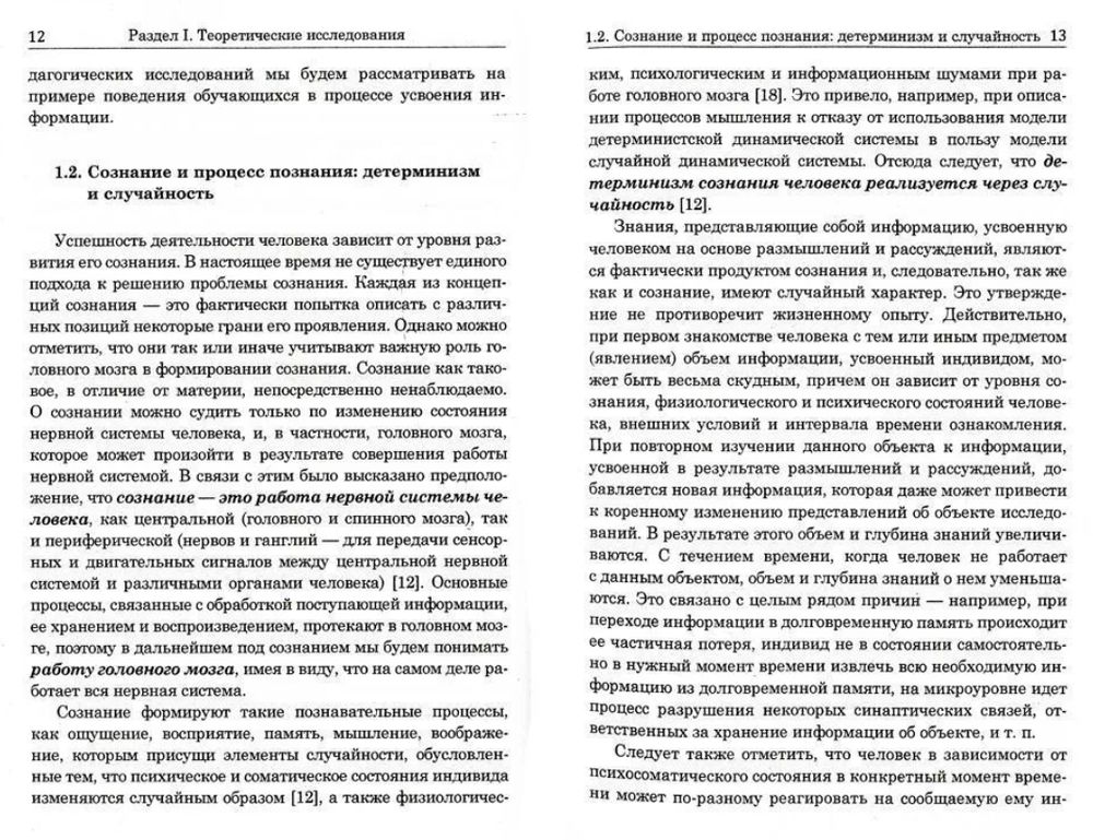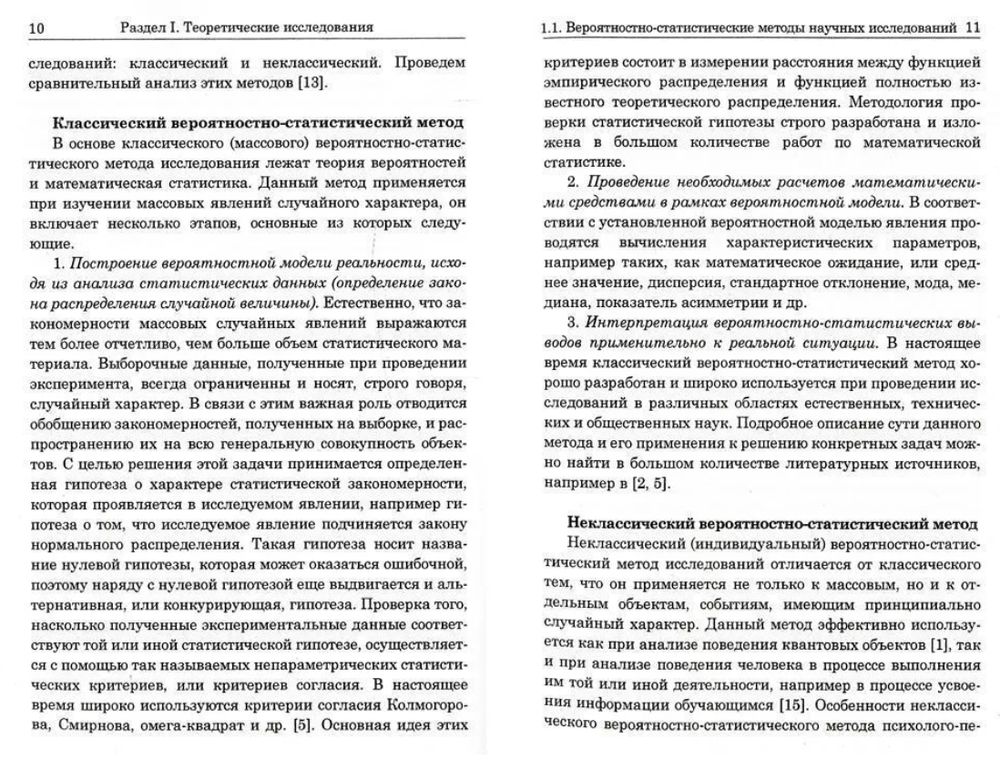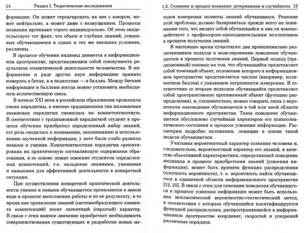 В монографии излагаются основы неклассического вероятностно-статистического метода научных исследований и его применения для решения психолого-педагогических задач, включающих построение вероятностно-статистической модели поведения обучающегося в процессе усвоения информации, метод шкалирования и процедуру оценки полноты знаний обучающегося; обобщаются результаты теоретических и экспериментальных исследований поведения студентов в процессе усвоения информации; рассматриваются вопросы моделирования функций распределения, идентифицирующих обучающихся в процессе усвоения информации, и влияния на модельные функции распределения погрешности измерения знаний. Для оценки вероятности усвоения материала учебной дисциплины обучающимися использовались дифференциальная и интегральная функции распределения.