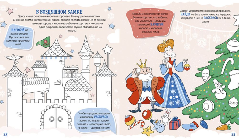 Для игры понадобятся только цветные карандаши или фломастеры. Берите книгу с собой, чтобы занять ребенка, где бы вы ни были: в гостях, в дороге или в путешествии. А на последних страницах ждет подарок – схема и бумажная заготовка для волшебной снежинки.