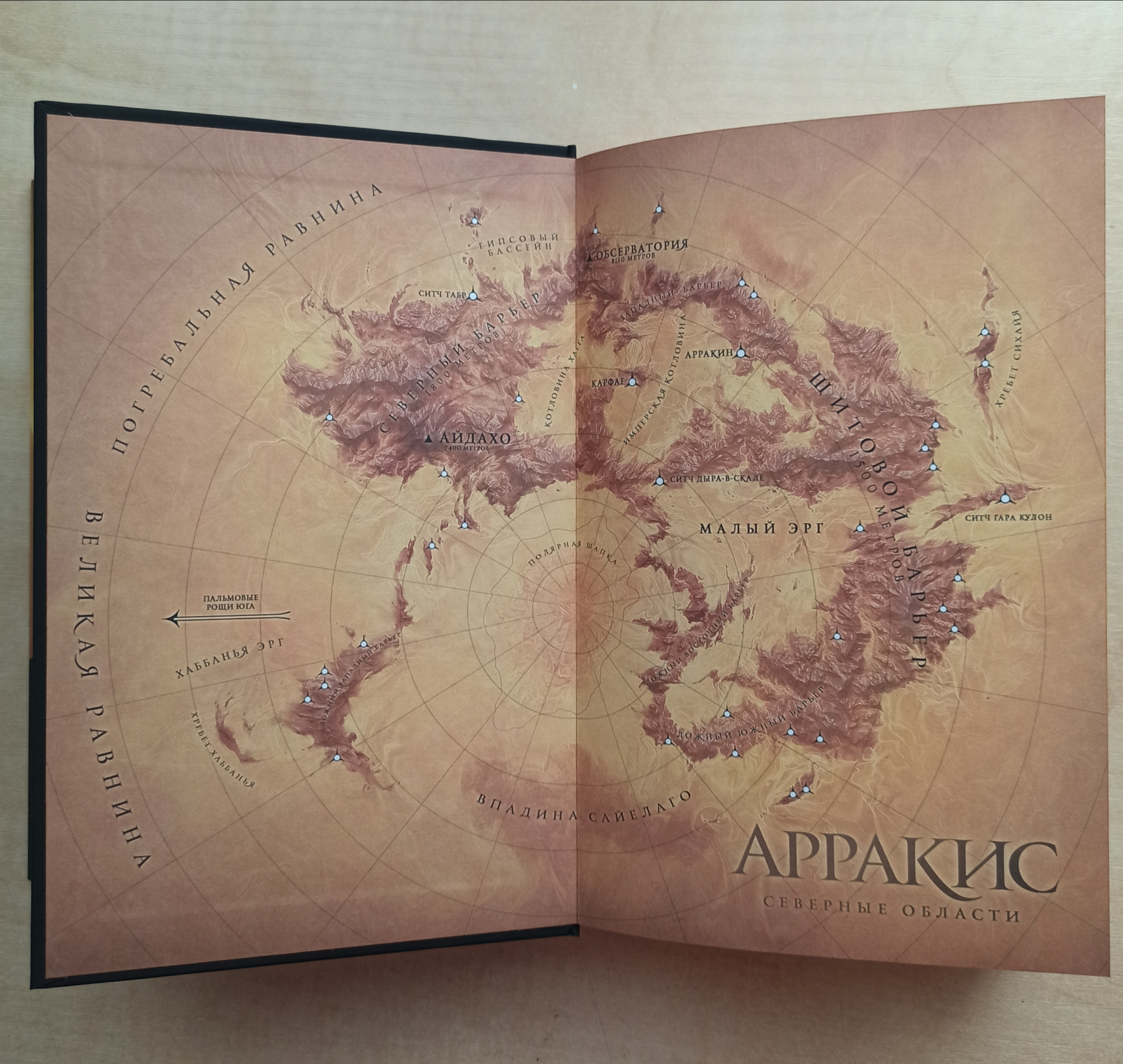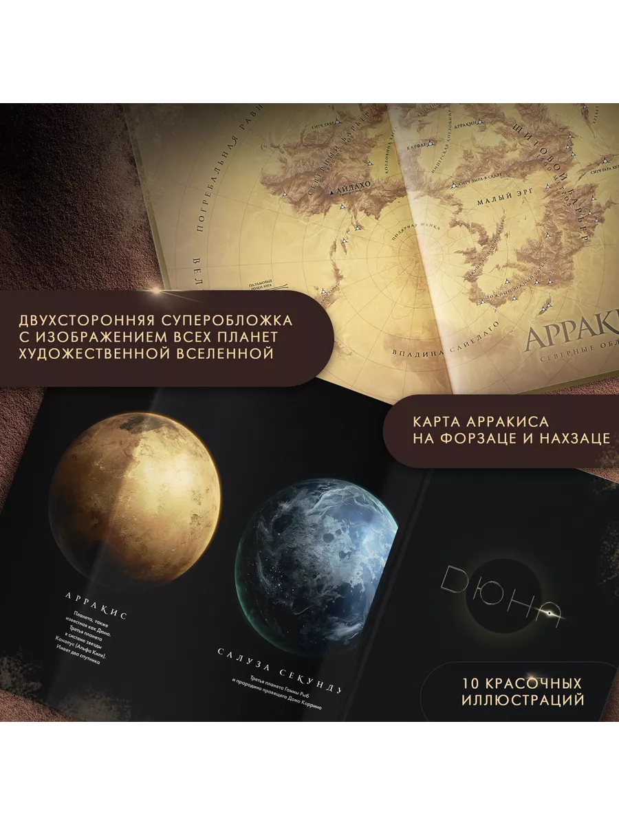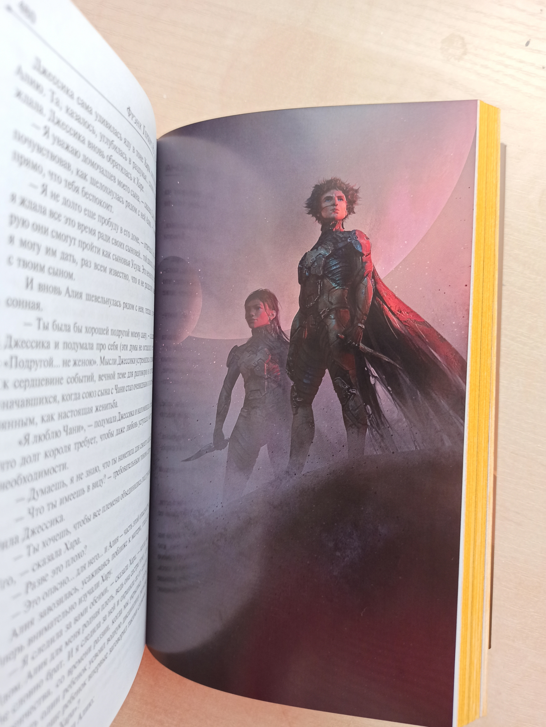 издание очень добротное. помимо красивого среза, очень порадовала проработка суперобложки с описаниями планет. в книге присутствует около 10 иллюстраций с хорошей печатью на глянцевой бумаге. на форзаце также присутствует карта арракиса. как приятное дополнение, есть приложение с более подробным описанием мира дюны, словарик, чтобы лучше понимать мир дюны.