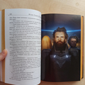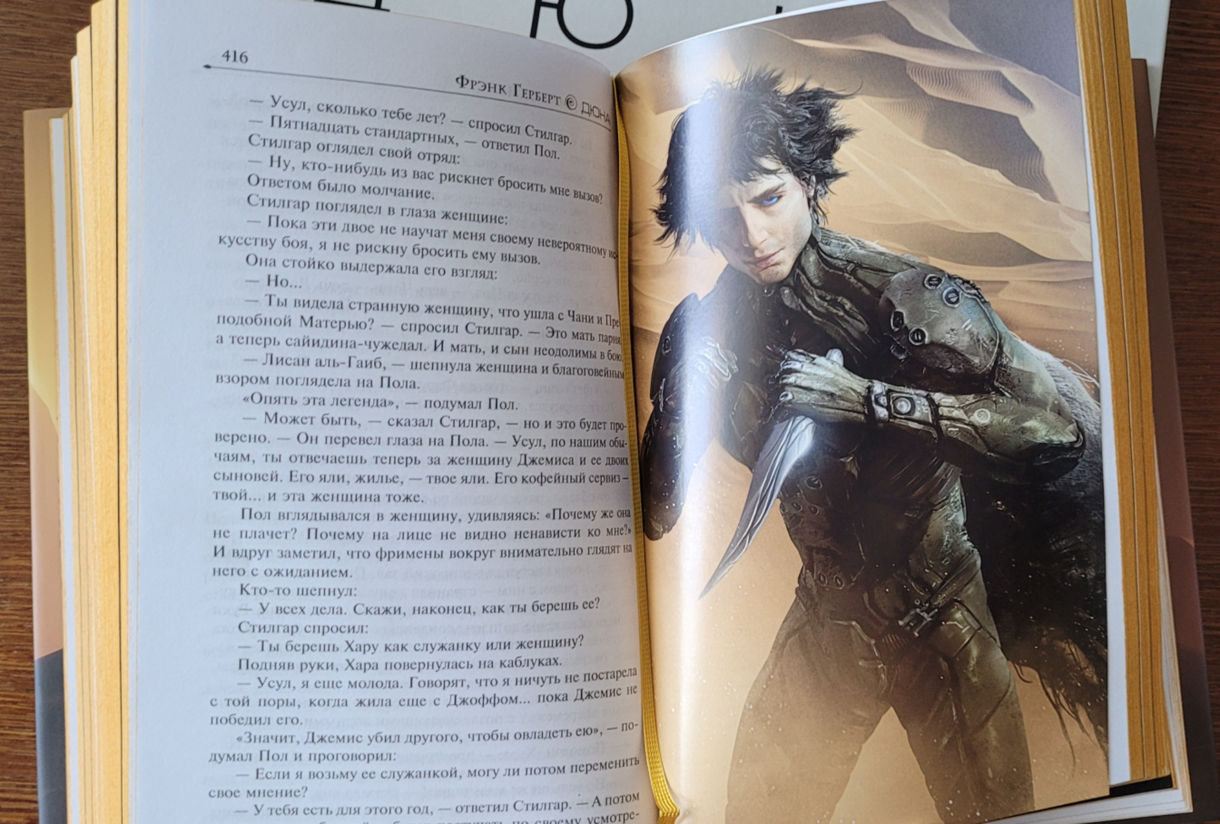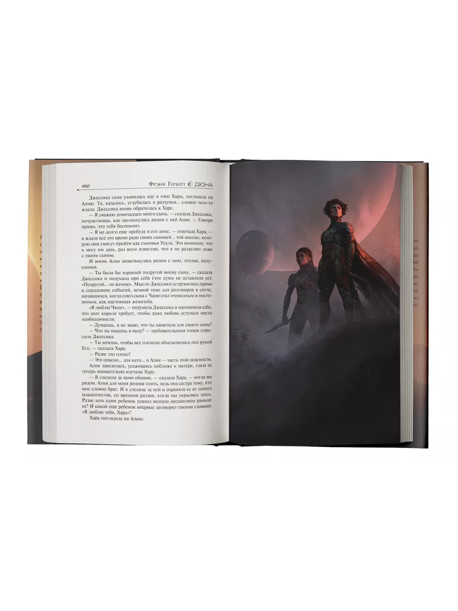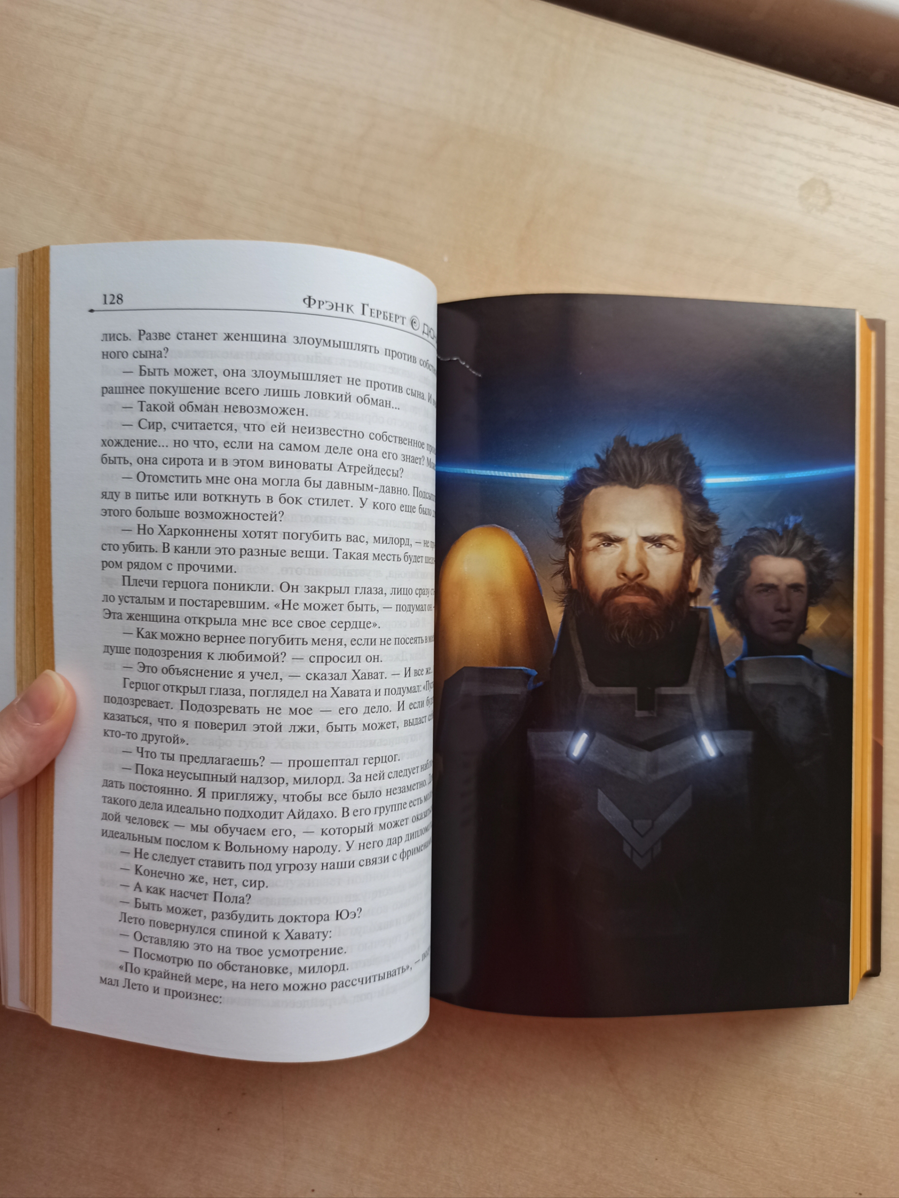 издание очень добротное. помимо красивого среза, очень порадовала проработка суперобложки с описаниями планет. в книге присутствует около 10 иллюстраций с хорошей печатью на глянцевой бумаге. на форзаце также присутствует карта арракиса. как приятное дополнение, есть приложение с более подробным описанием мира дюны, словарик, чтобы лучше понимать мир дюны.