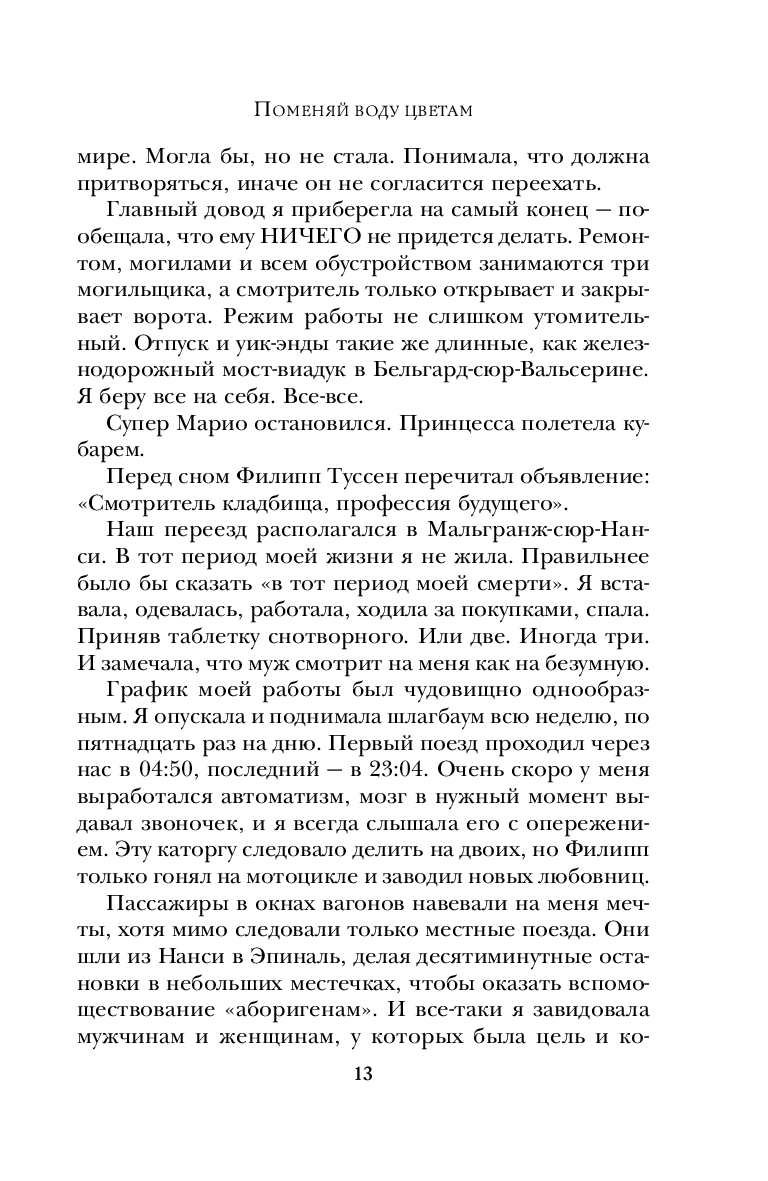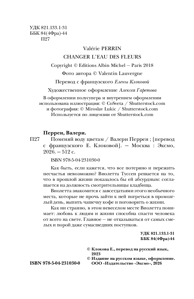 "Поменяй воду цветам" – это роман о чувствах, понятных каждому, и о торжестве жизни над смертью. Валери Перрен исцеляет душу читателя, проращивая в ней сад прекрасных цветов, освещенных солнечными лучами надежды.