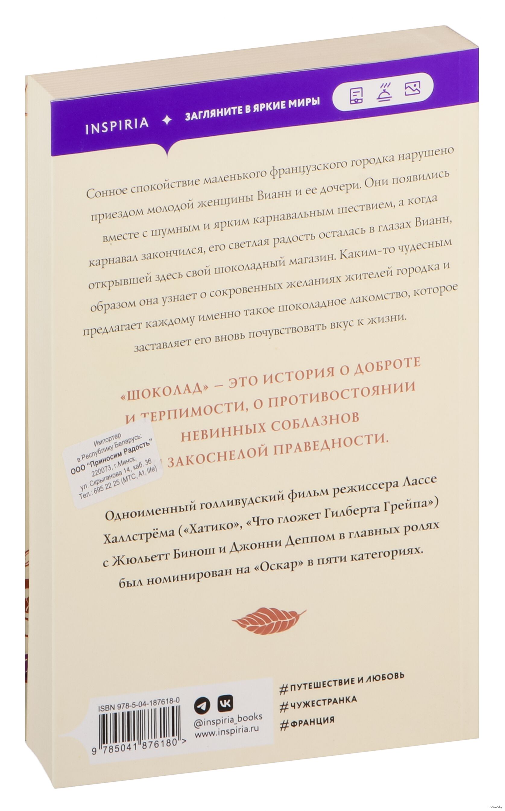 Этот роман уже много лет остается абсолютным бестселлером, его читают поклонники Харрис во всем мире. "Шоколад" – первый роман из четырех, которые Харрис посвятила страннице Вианн и жителям французского городка Ланскне-су-Танн.