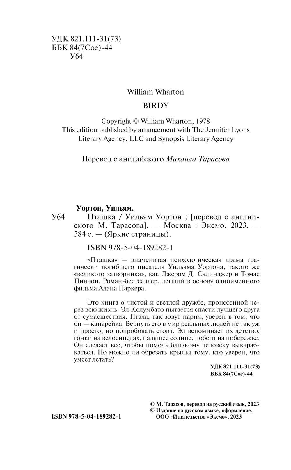Признанный американской классикой роман "Пташка" Уильяма Уортона не оставит равнодушным ни одного читателя пронзительным психологизмом и верой в мечту, нарушающей представления о здравомыслии этого мира.