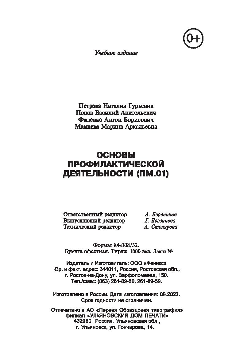 Учебник предназначен для студентов, преподавателей системы среднего медицинского профессионального образования, бакалавров сестринского дела; может быть интересен также для студентов медицинских вузов и всех, кто интересуется организацией профилактики.