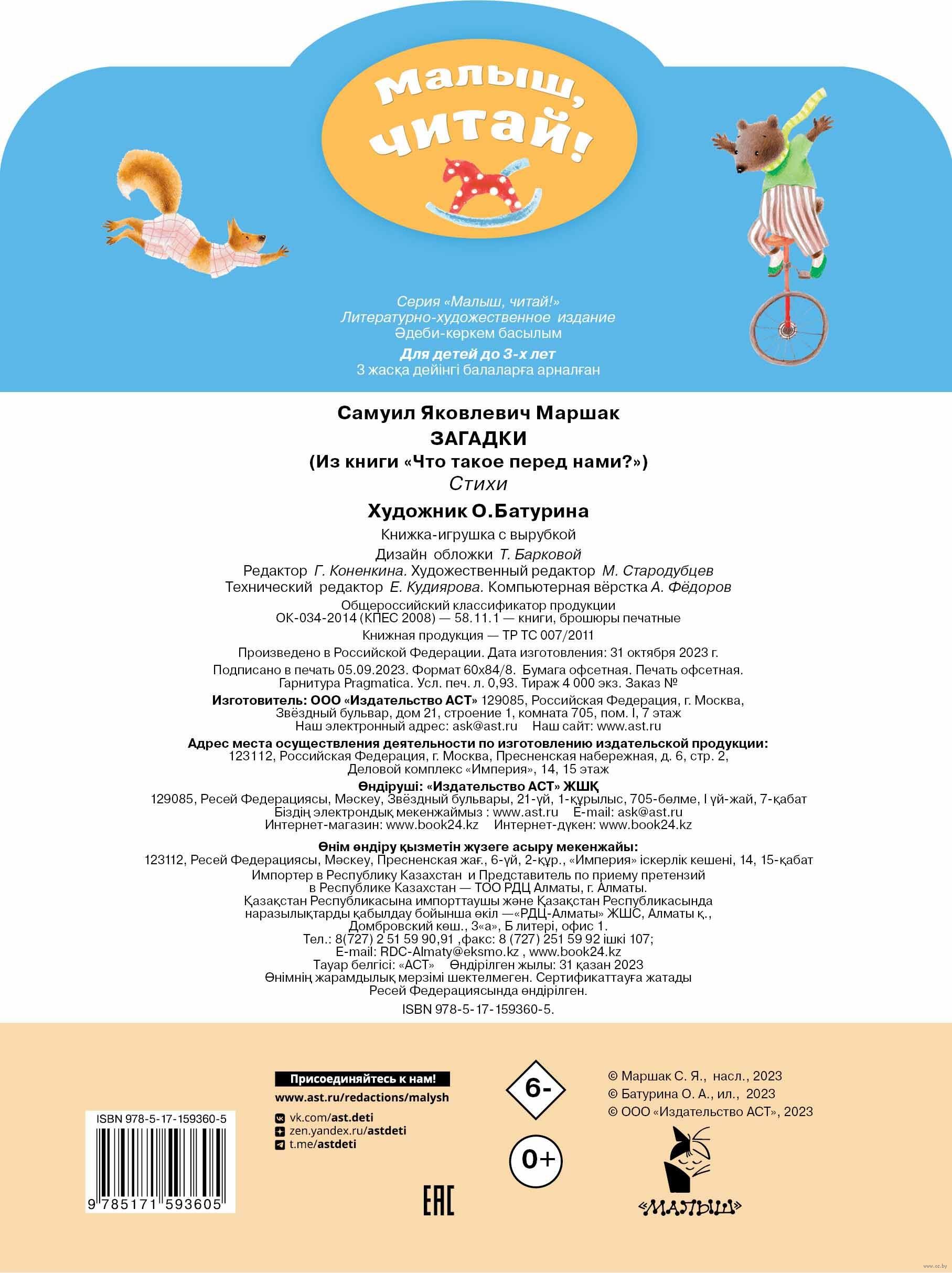 Что это за синий домик с маленькой дверцей-щёлкой? Кого бьют рукой и палкой, а он не обижается? Кто ходит и днём и ночью, но никак не может уйти? Ответы на эти загадки вы наёдёте в книге замечательного детског поэта-классика С. Маршака.