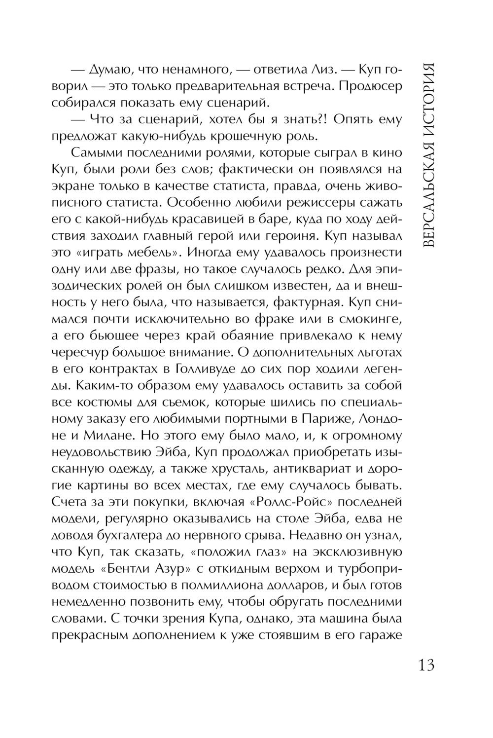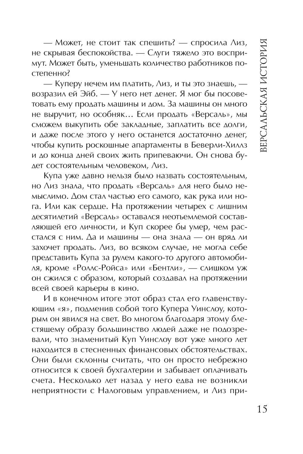 Да, все действительно случилось в "Версале" – так называется роскошный особняк нестареющего и неотразимого Купера Уинслоу – голливудской звезды первой величины. В его карьере наступили не лучшие времена, давно нет интересных ролей, а следовательно и гонораров... Но Купер не может и помыслить о том, чтобы расстаться с расточительным образом жизни. Он привык обольщать, быть в центре событий. И события не заставляют себя ждать, причем самые невероятные...