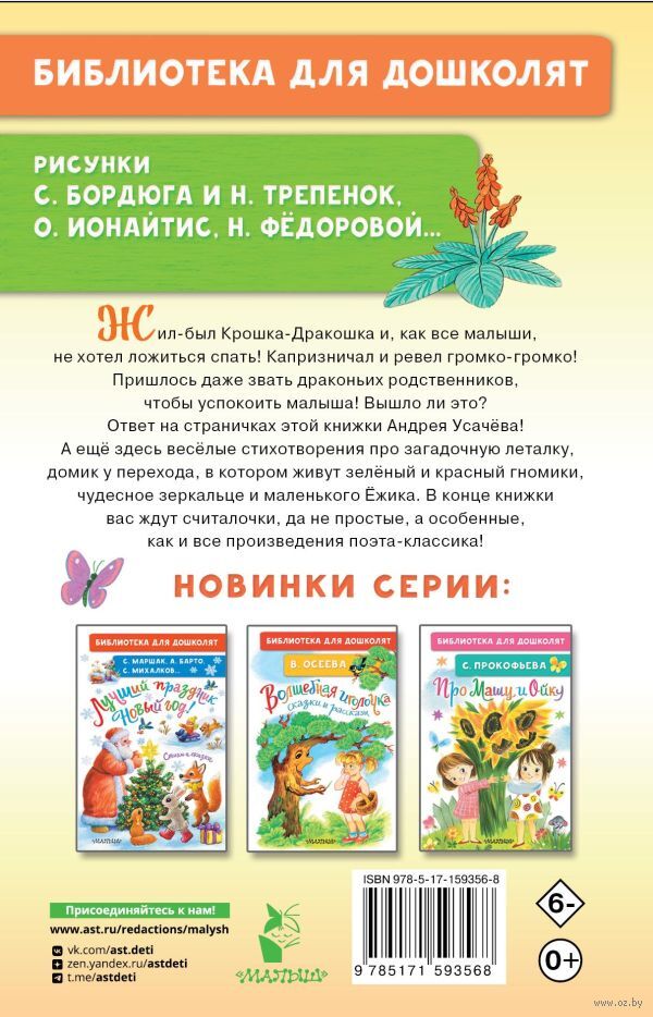 В книгу "Про крошку-Дракошку" вошли самые весёлые стихотворения поэта-классика Андрея Усачёва: "Леталка", "Домик у перехода", "Про крошку-Дракошку" и другие. А также забавные считалочки, в которых с юмором обыгрываются знаменитые народные сюжеты. Малыши с удовольствием послушают стихи, рассмотрят большие картинки на каждой страничке, а потом уже и сами попробуют прочитать эти смешные произведения.