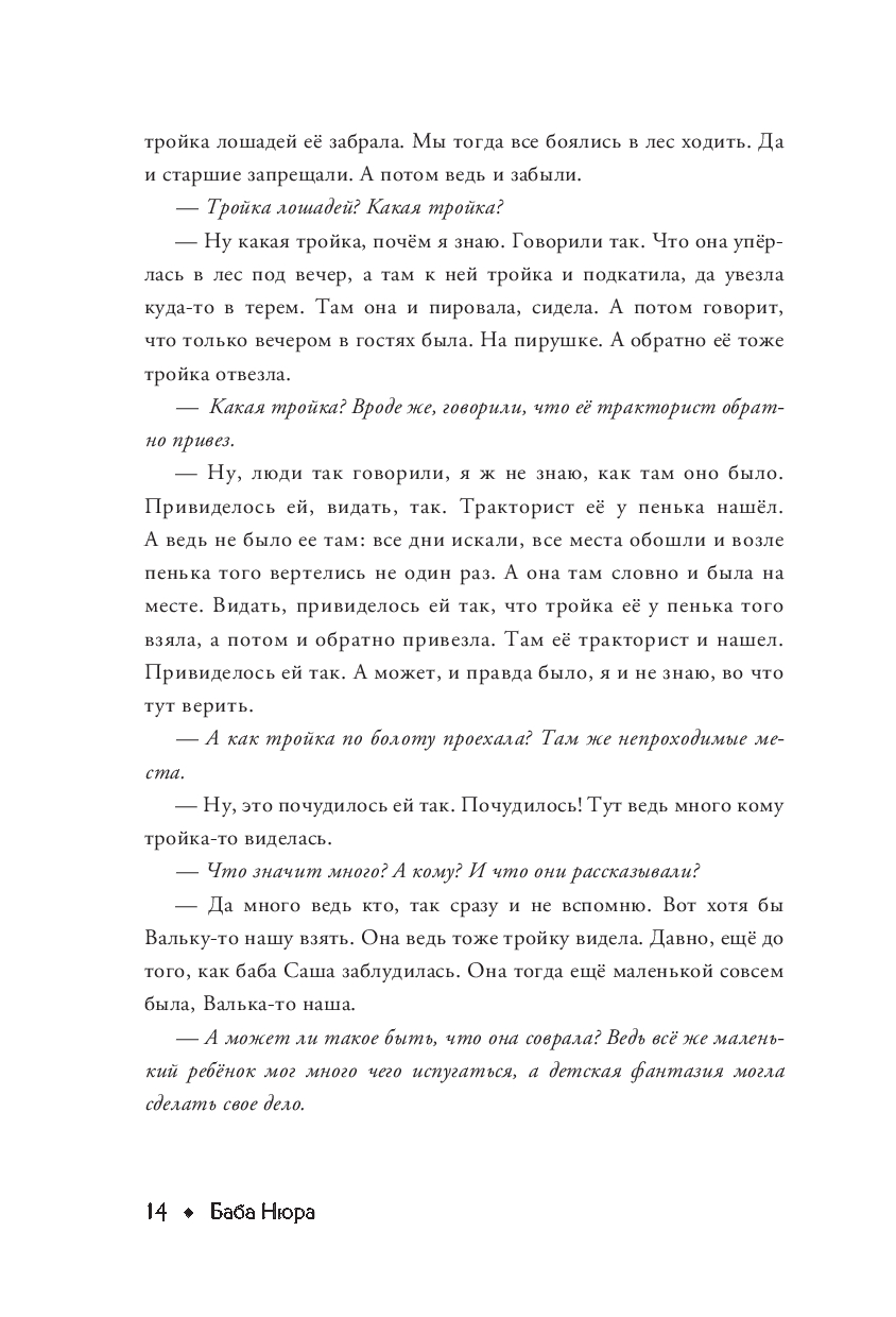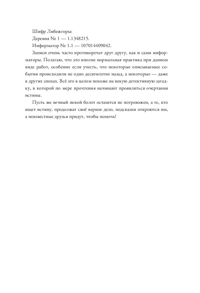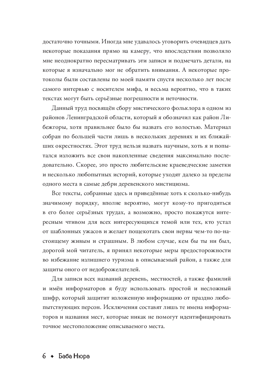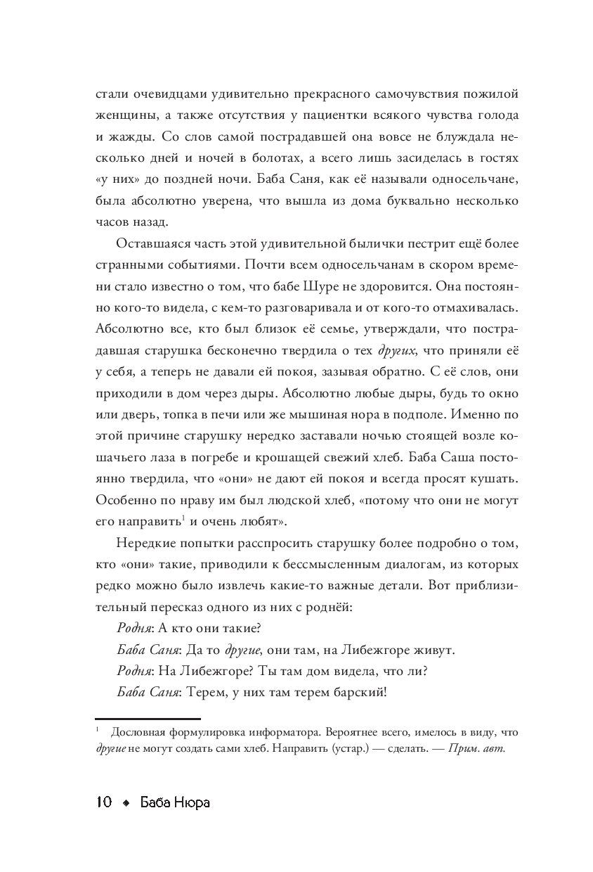 Перед вами сборник мистических деревенских легенд, кропотливо собранных лабораторией, выбравшей себе красноречивое название "Баба Нюра". В течение нескольких лет куратор проекта исследовал один из самых загадочных районов Ленинградской области – Либежгору. Появляющаяся как будто ниоткуда тройка, пугающие другие, о которых мало кому что-то известно, голоса из леса, те, кто живет в подполье... Это лишь несколько загадочных фактов, о которых информаторы спокойно, как о чем-то обычном рассказывали представителю лаборатории.