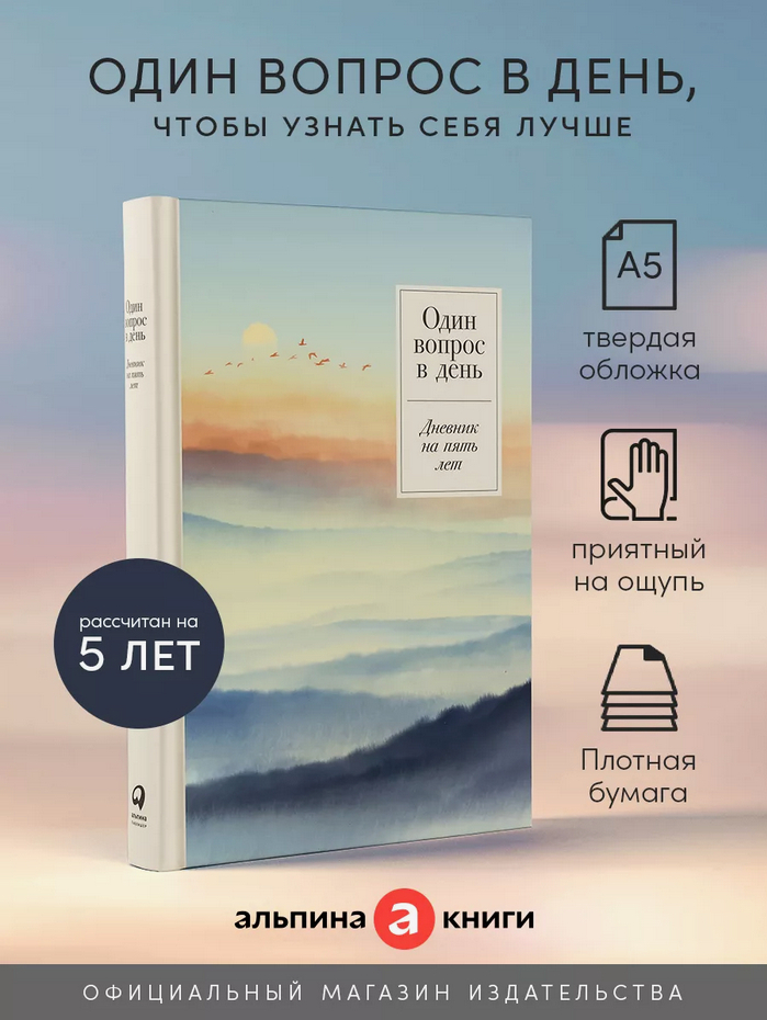 На каждой странице этого пятибука вы найдете вопрос, отвечая на который каждый год в один и тот же день, вы сможете проанализировать изменения своего состояния и мыслей. Здесь собраны разные вопросы – от прозаических до тех, которые касаются смысла жизни. Ежедневник поможет расслабиться после напряженного дня, отдохнуть, привести мысли в порядок, а также повысить осознанность, научиться фиксировать мысли и эмоции.