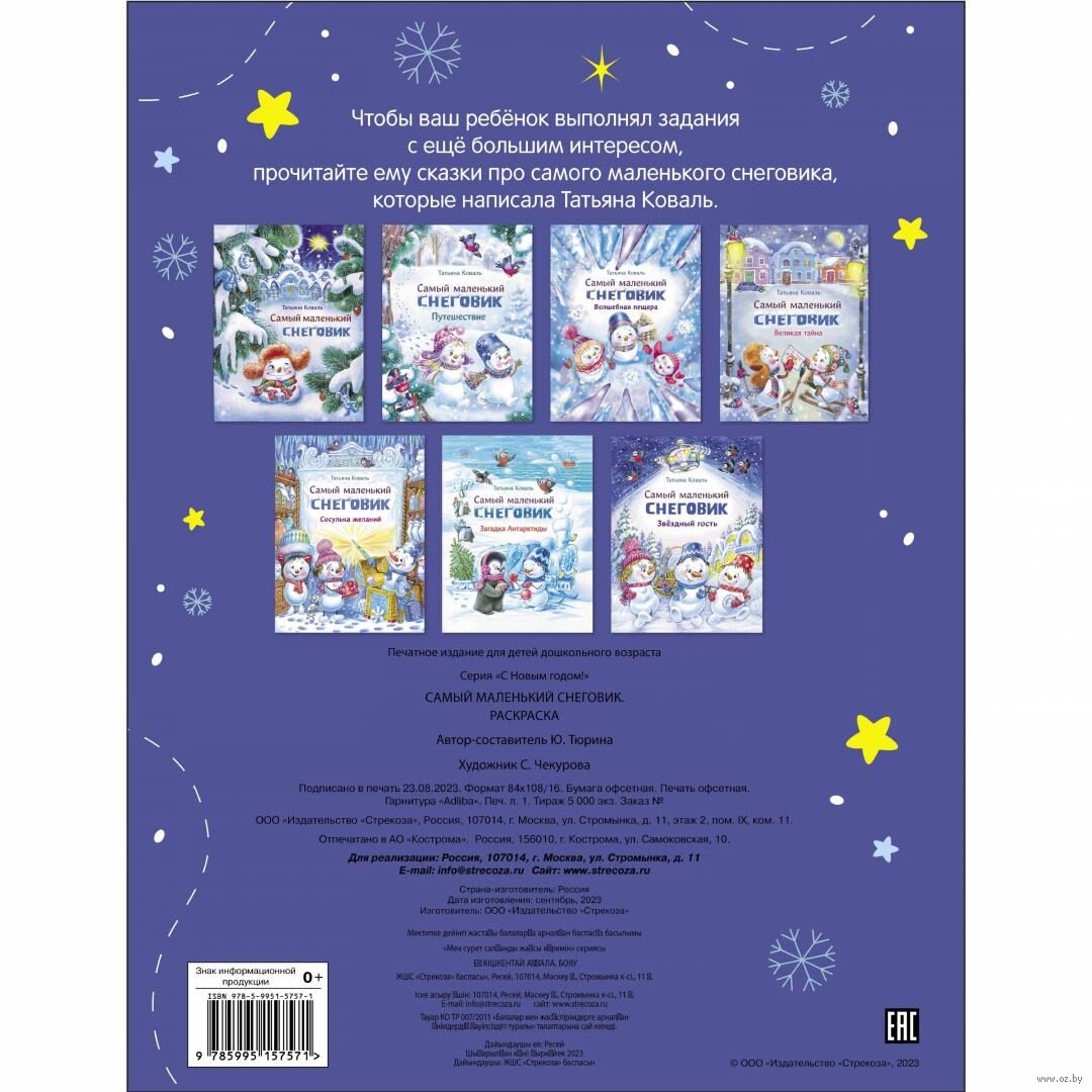 Новый год не за горами? Думаете, чем занять ребёнка в новогодние каникулы, например, в дороге? Хотите подарить ему полезный подарок? Раскраска по мотивам историй Татьяны Коваль про самого маленького снеговика отлично подойдёт. Для раскрашивания картинок и выполнения заданий вашему юному художнику понадобятся цветные карандаши и хорошее настроение.