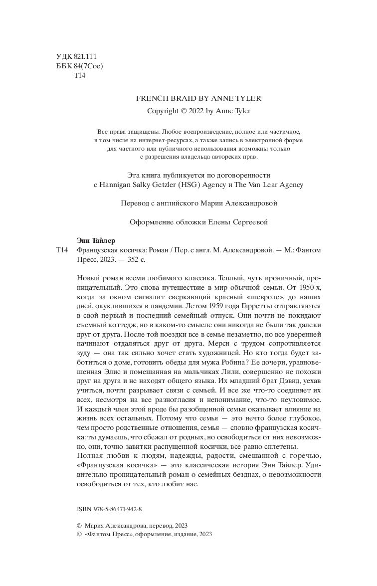Полная сарказма и веселья, "Французская косичка" – это классическая история Энн Тайлер. Сверхъестественно проницательный роман о семейных безднах, о невозможности освободиться от тех, кто любит нас.