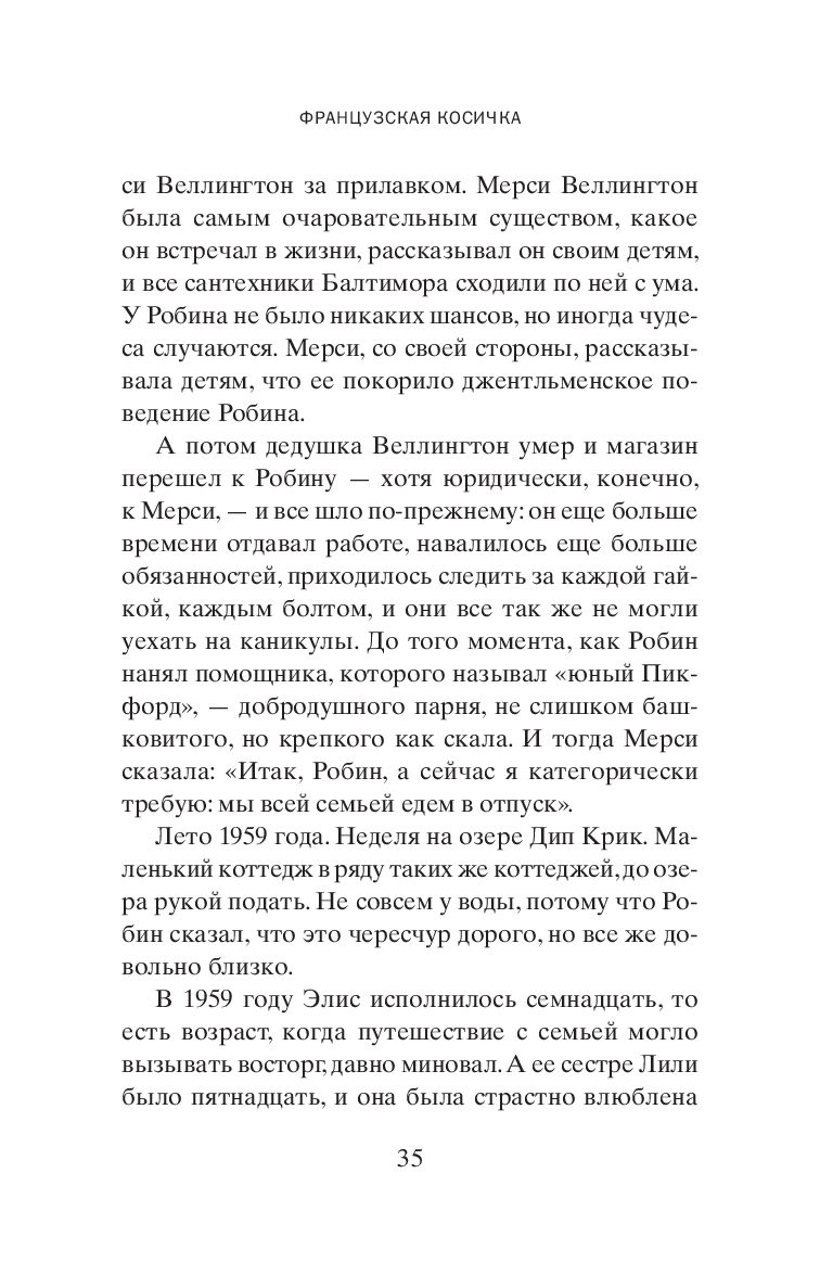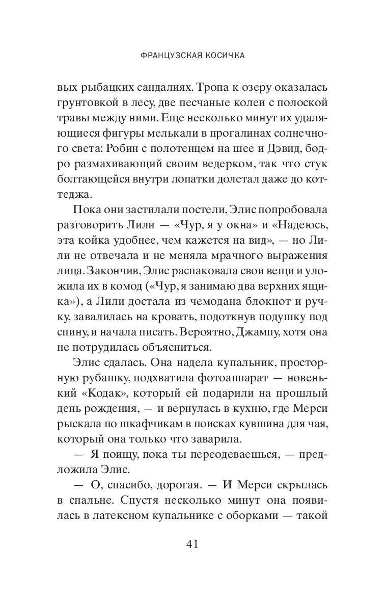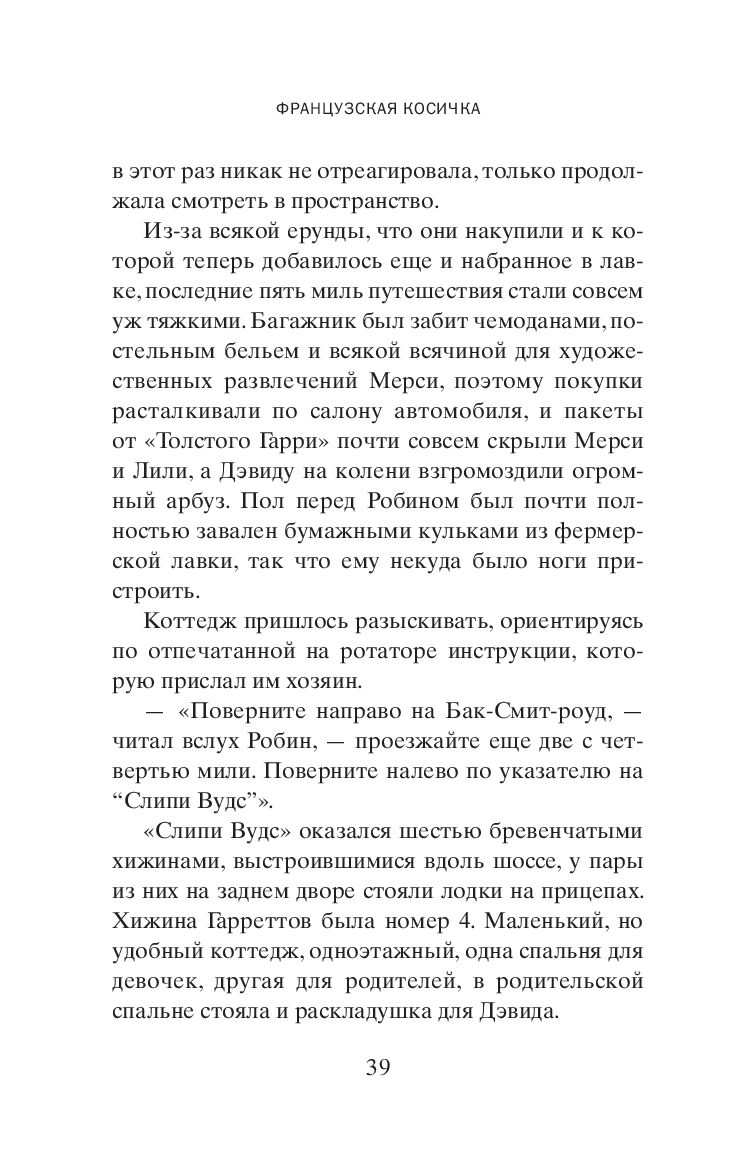 Летом 1959 года Гарретты отправляются в свой первый и последний семейный отпуск. Они почти не покидают съемный коттедж, но в каком-то смысле они никогда не были так далеки друг от друга. Мерси с трудом сопротивляется зуду – она так сильно хочет стать художницей. Но кто тогда будет заботиться о доме, готовить обеды для мужа Робина? Ее дочери-подростки, уравновешенная Элис и помешанная на мальчиках Лили, совершенно не похожи друг на друга. Их младший брат Дэвид уехав учиться, почти разрывает связи с семьей. И все же что-то соединяет их всех, несмотря на все разногласия и непонимание, что-то неуловимое. И каждый член этой вроде бы разобщенной семьи оказывает влияние на жизнь всех остальных. Потому что семья – это нечто более глубокое, чем просто родственные отношения, семья – словно французская косичка: ты думаешь, что сбежал от родных, но освободиться от них невозможно, они, точно завитки окружают по-прежнему держатся рядом.
